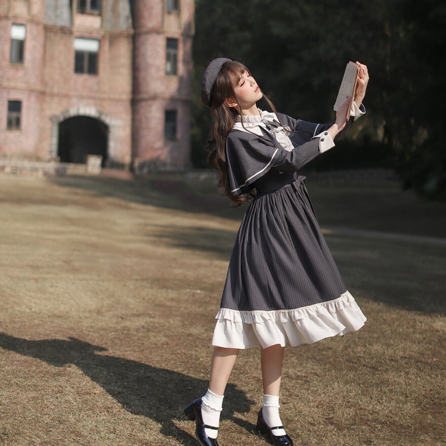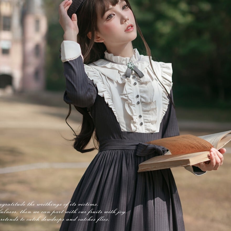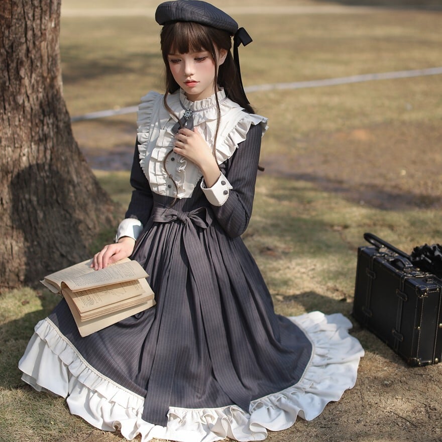 紺色ストライプ柄の生地に、オフホワイトの繊細なレースやフリルが襟元、袖、裾にあしらわれた、クラシカルロリータのワンピースです。