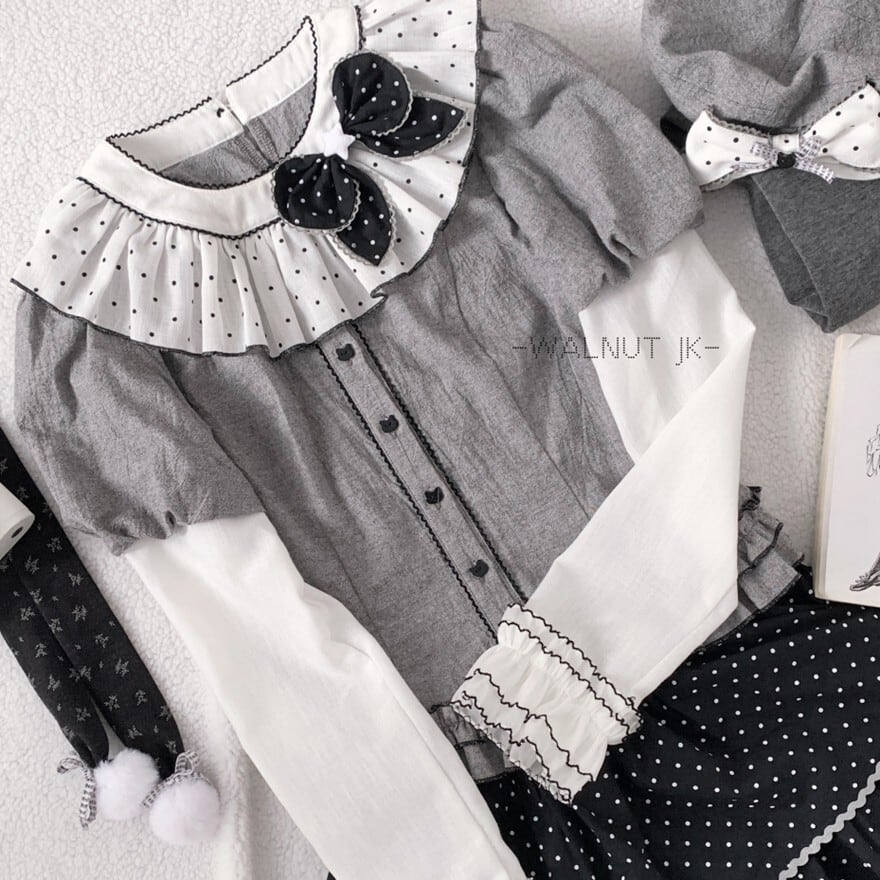 森ガール風 ブラウス フェイクツーピース 水玉 パフスリーブ 胡桃木