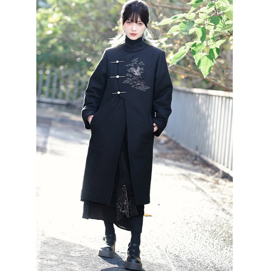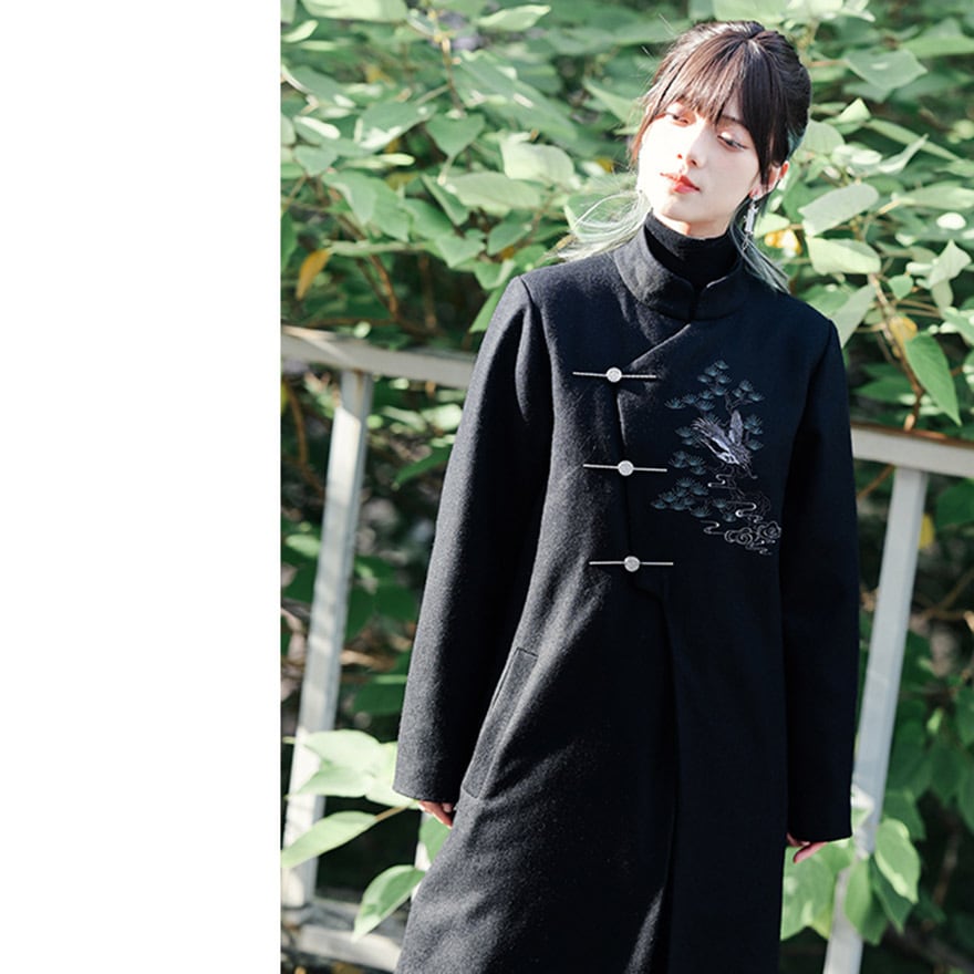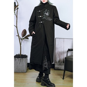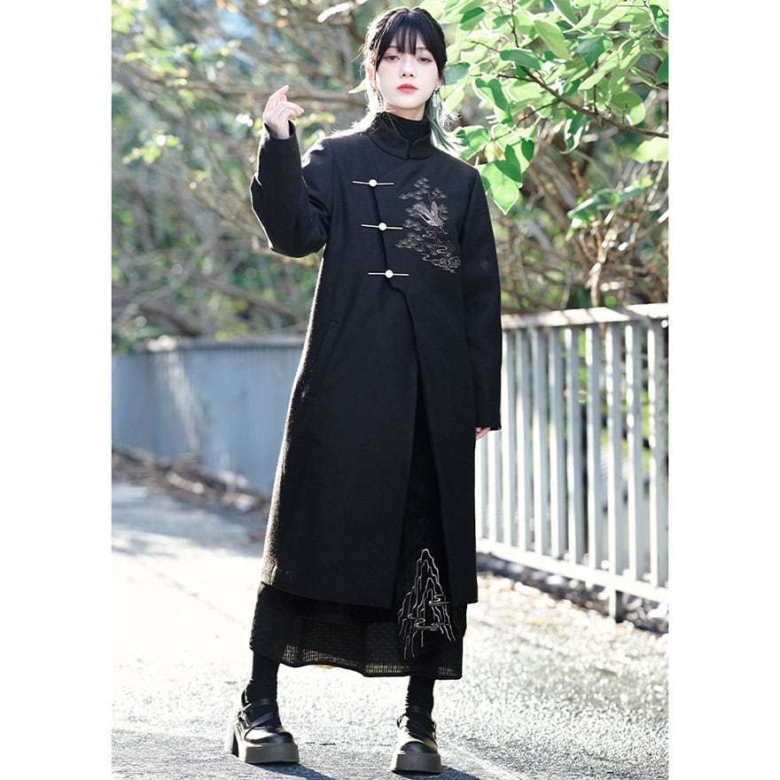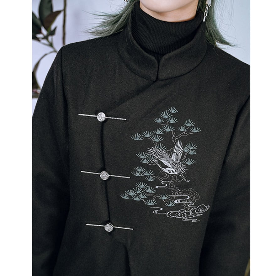 漆黒の厚手の生地に、繊細な鶴と松、雲の刺繍が施された、サブカルチャーの雰囲気が漂うチャイナ風のロングジャケットです。