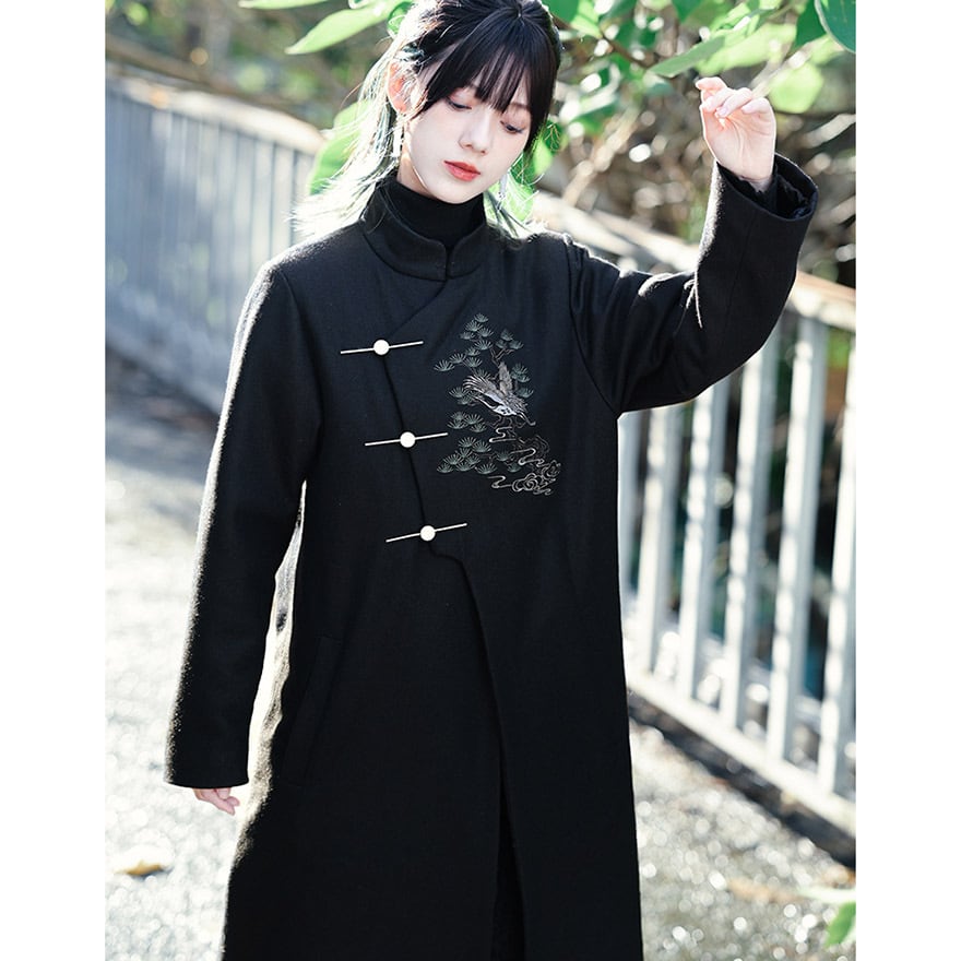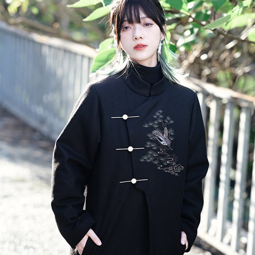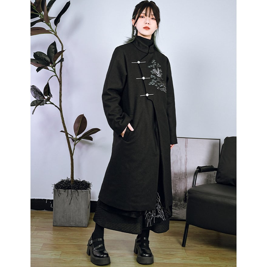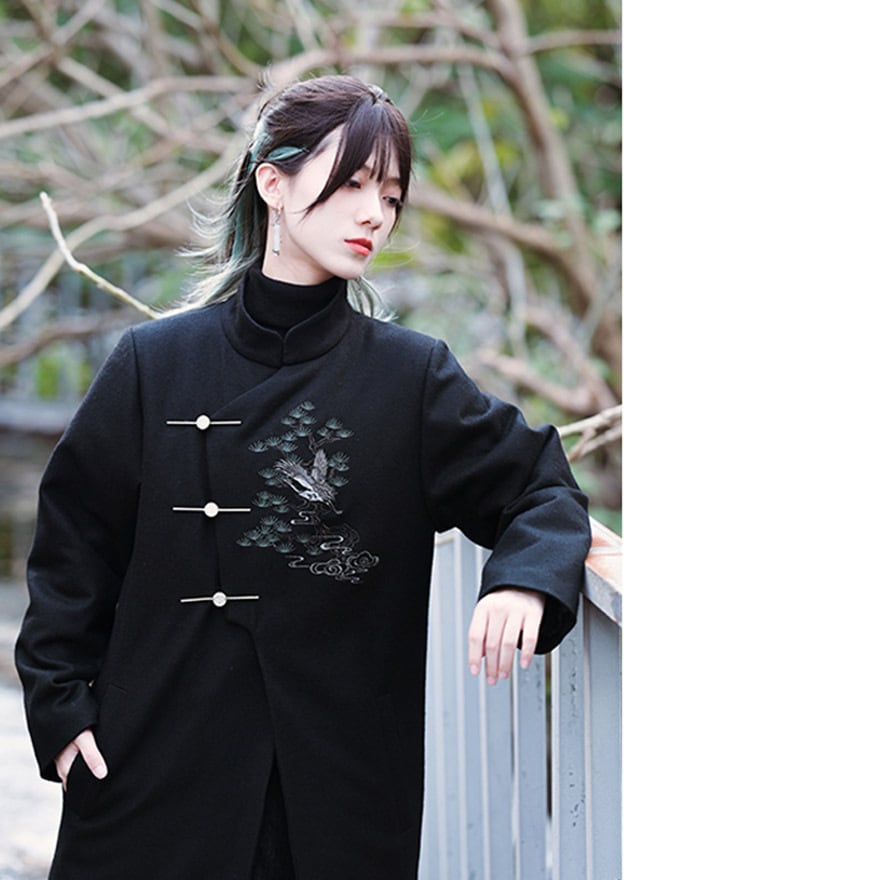 漆黒の厚手の生地に、繊細な鶴と松、雲の刺繍が施された、サブカルチャーの雰囲気が漂うチャイナ風のロングジャケットです。