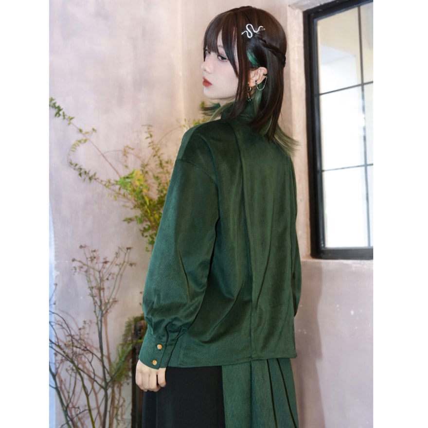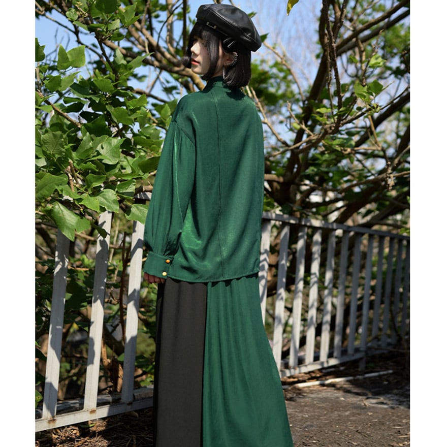 スタンドカラーやチャイナボタン風のディテールが、オリエンタルでミステリアスな雰囲気を演出します。