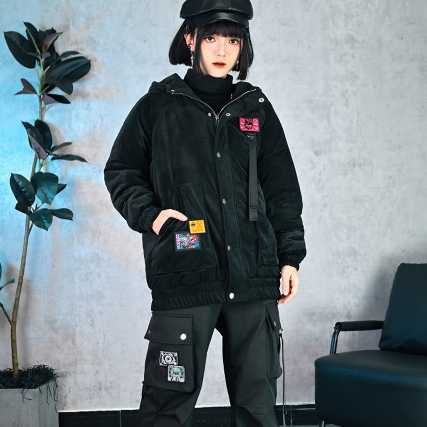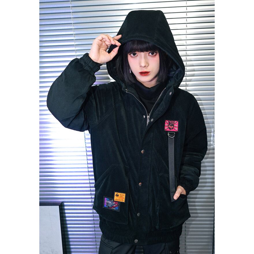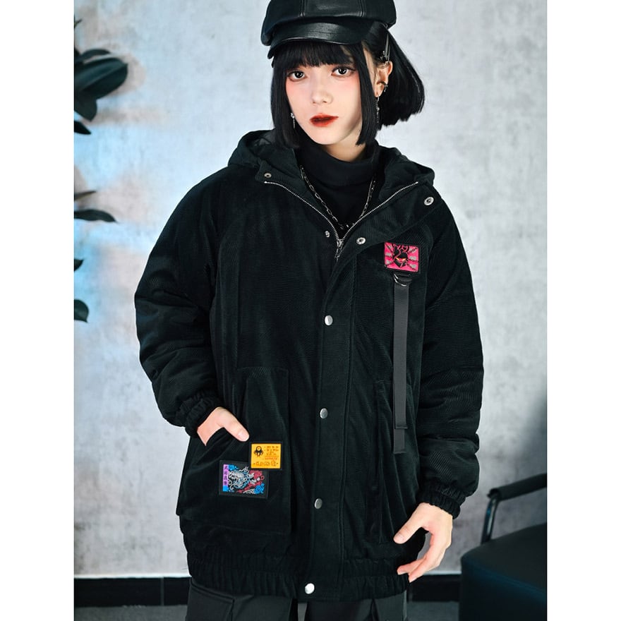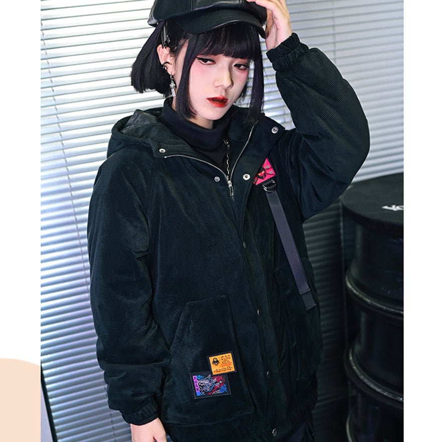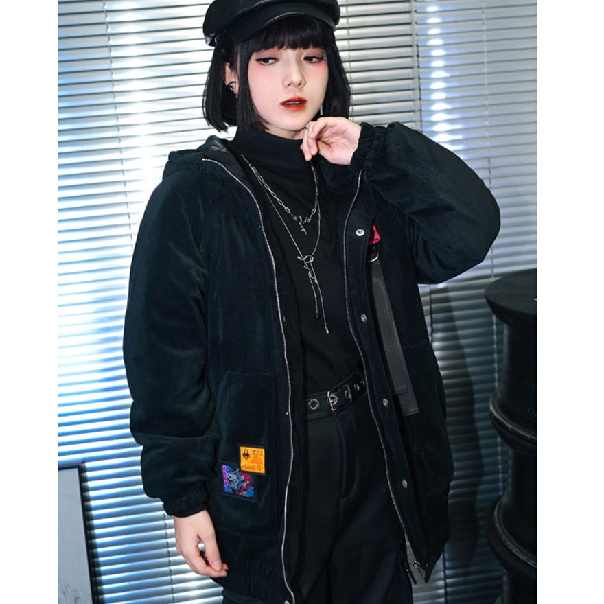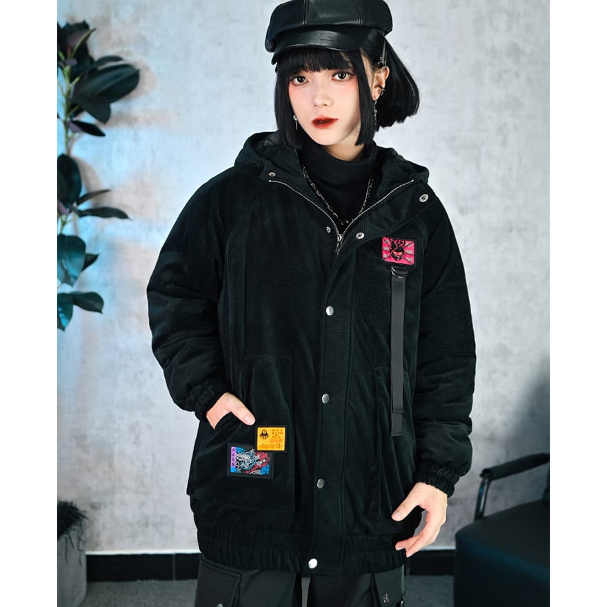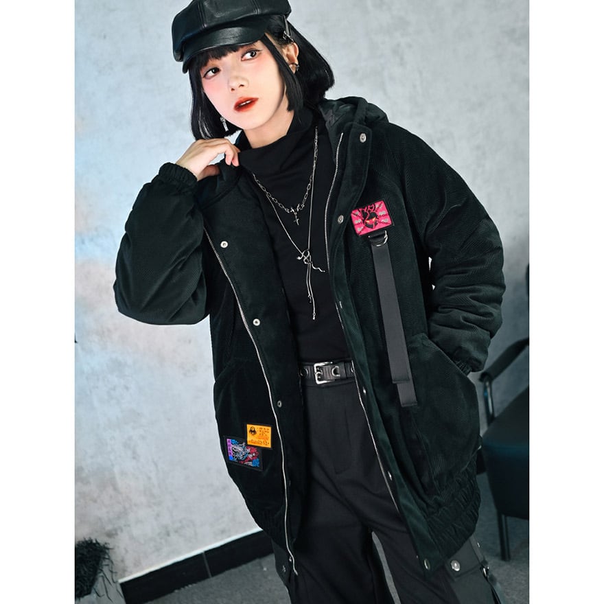 サブカル系 Monster CLUBコーデュロイ デザイン フード付きキルティングコットジャケット 古怪舎