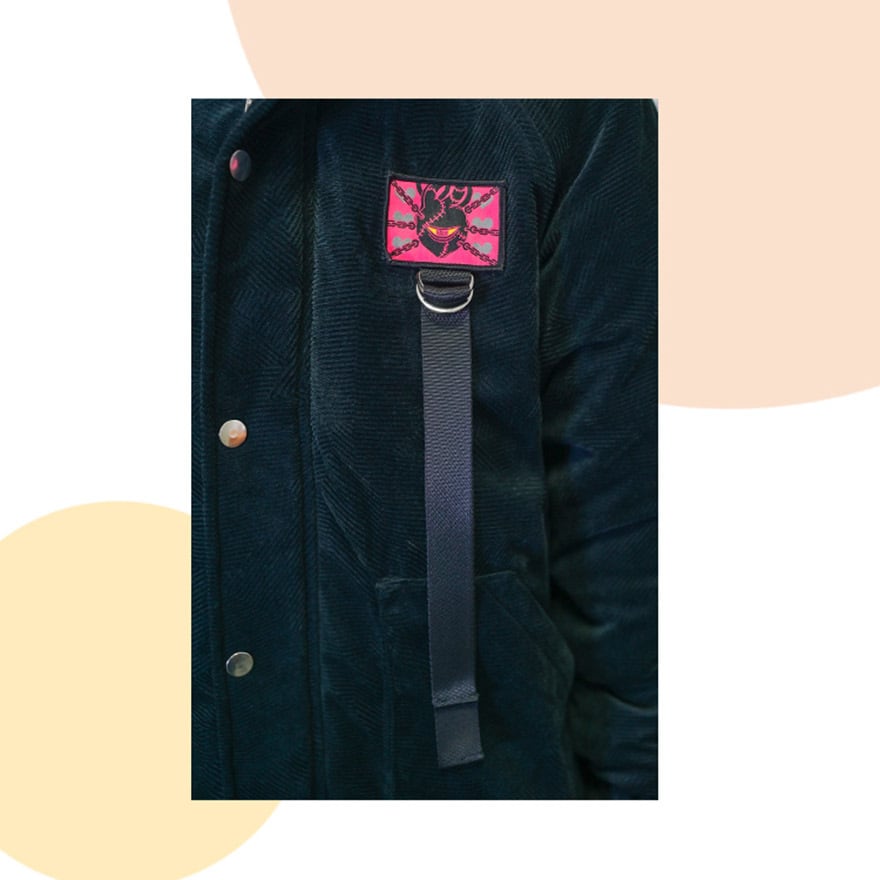 胸元とポケットにあしらわれた、モンスターやサイバーパンクを彷彿とさせるカラフルで毒っ気のあるワッペンが、ダークでポップなアクセントになっています。