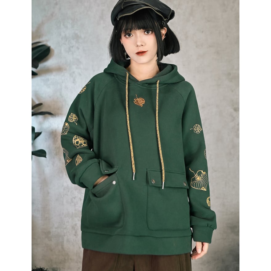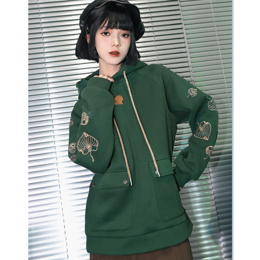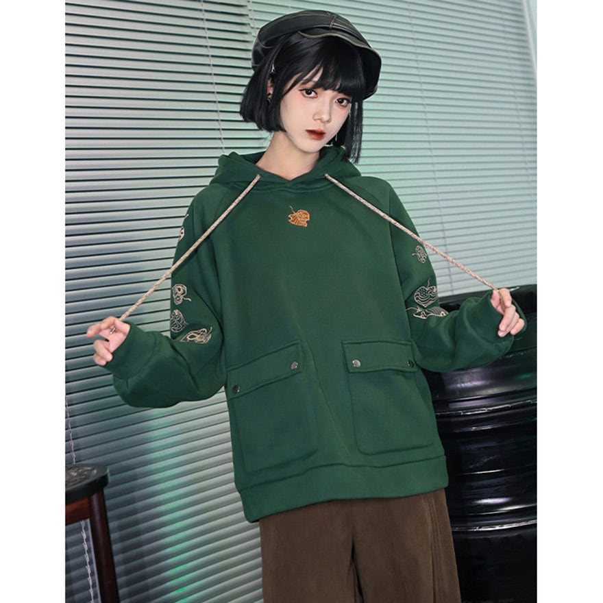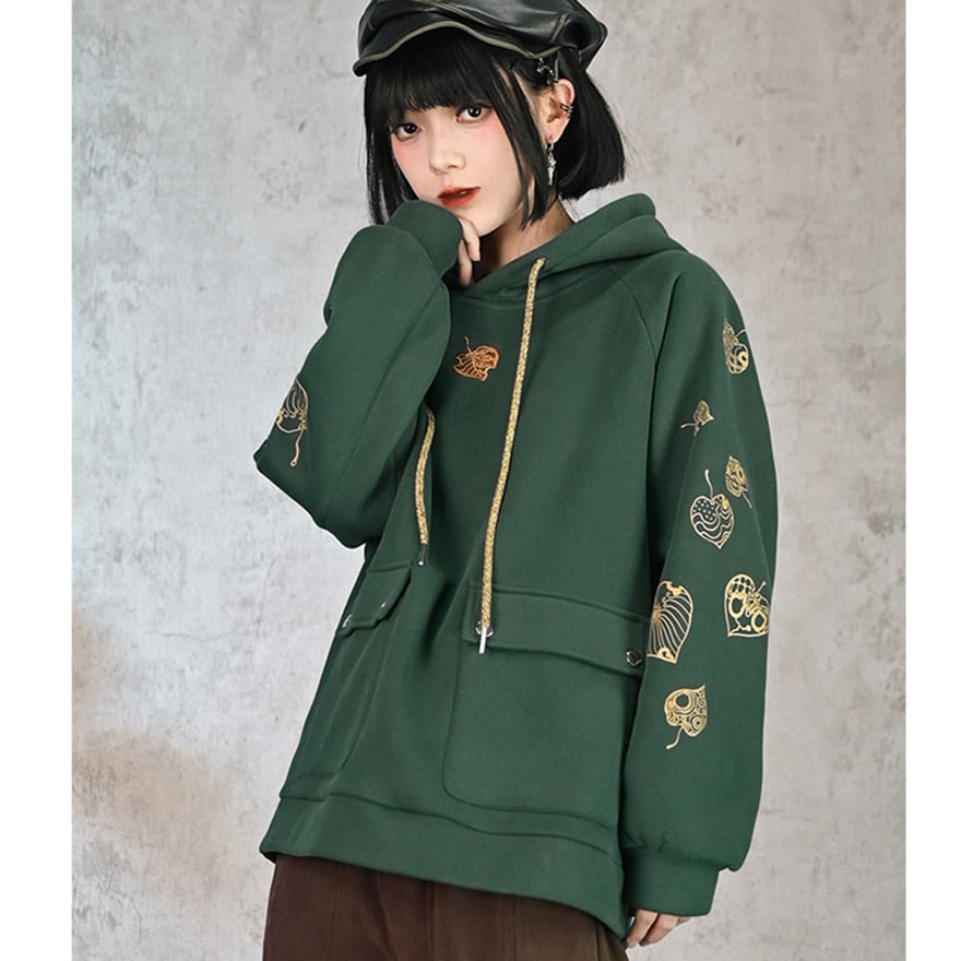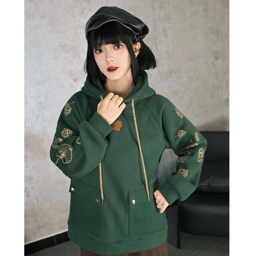 サブカル系 中華風 プリントフード付きフリース パーカー スウェットシャツ 古怪舎