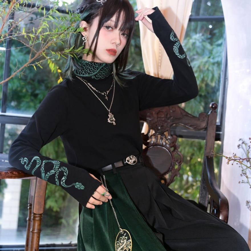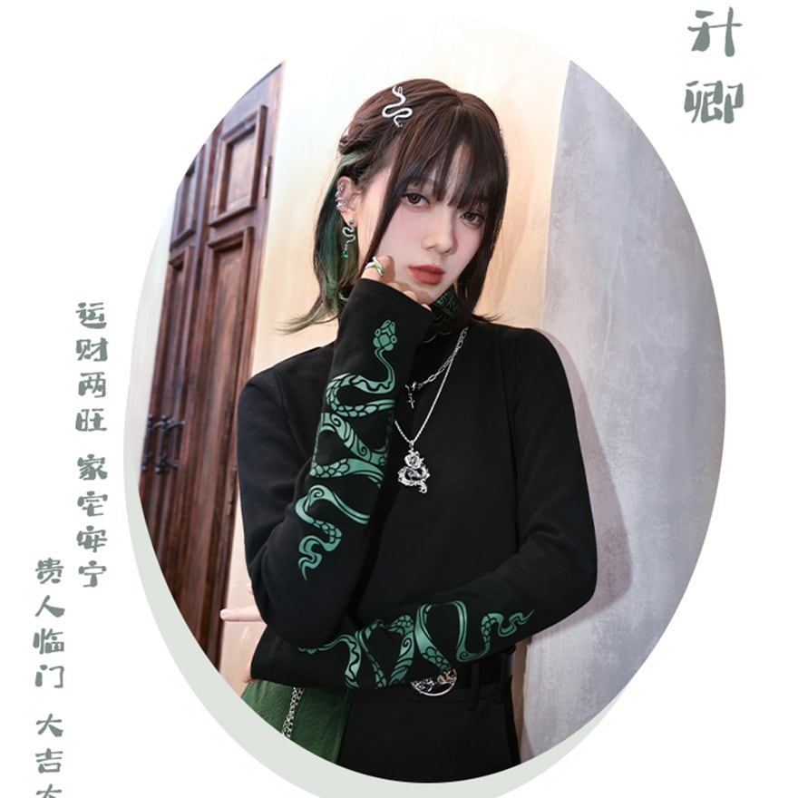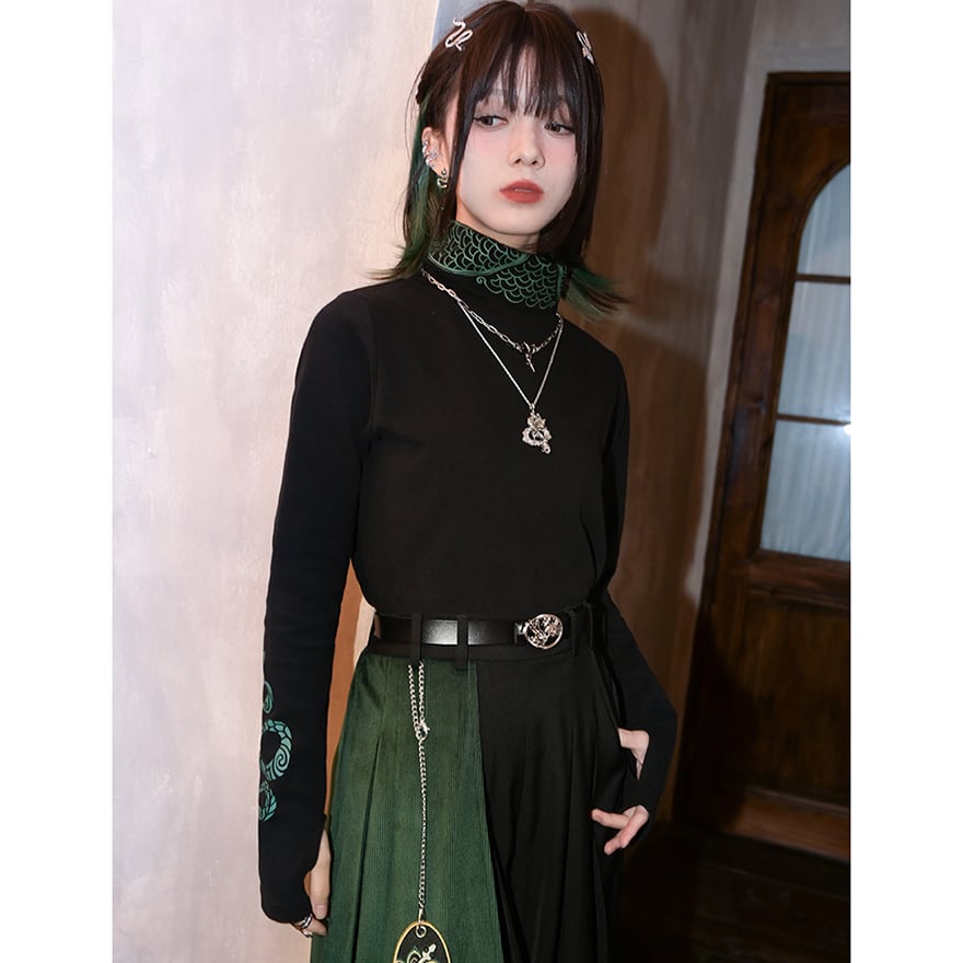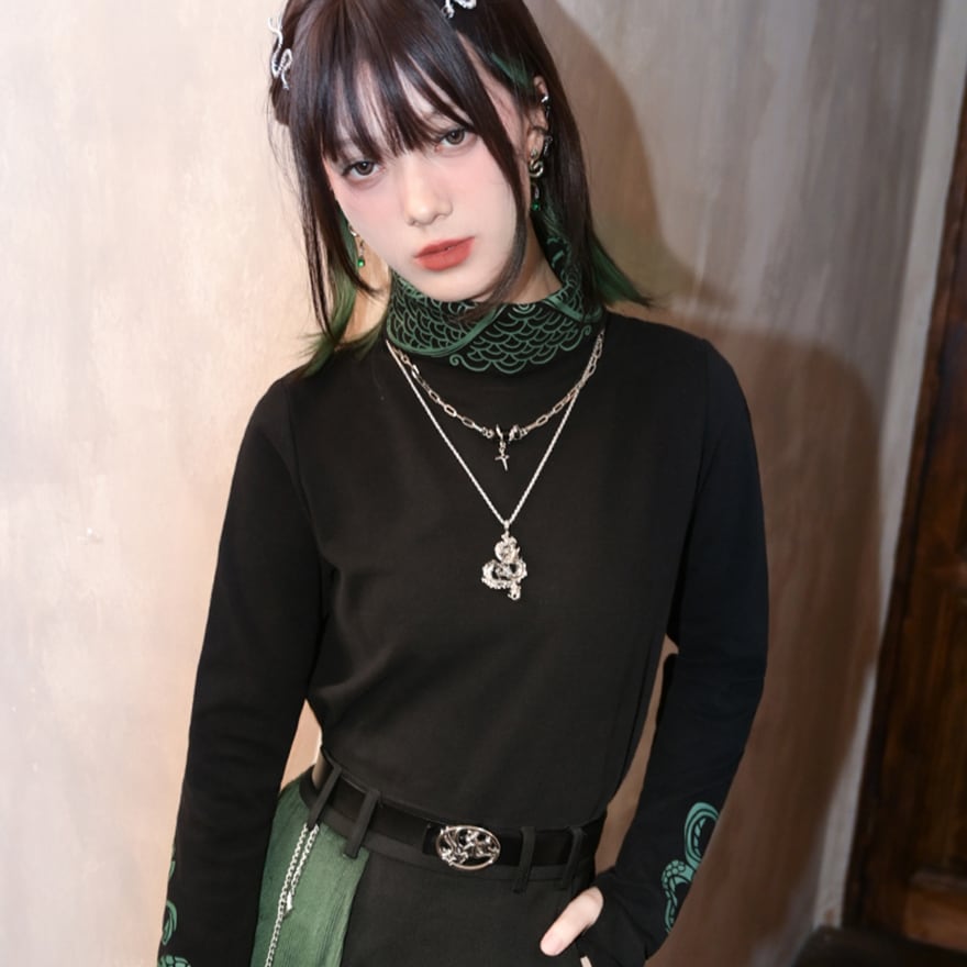 身体にフィットする黒のハイネックTシャツに、首元と両袖に龍をモチーフにしたオリエンタルなプリントが施されています。