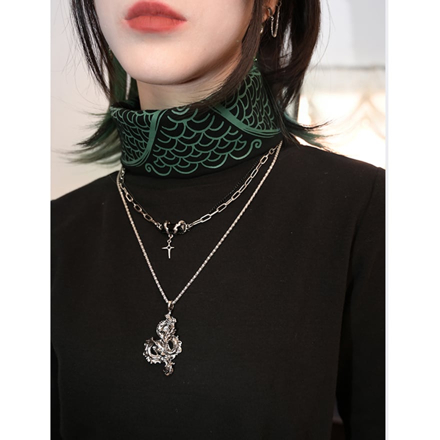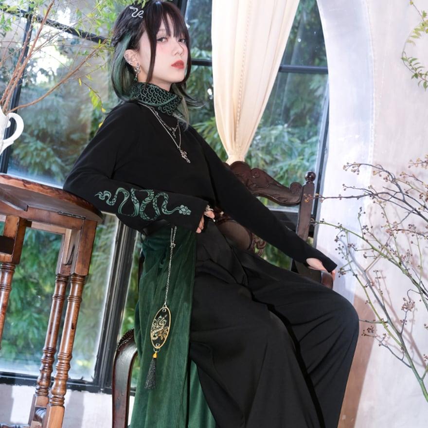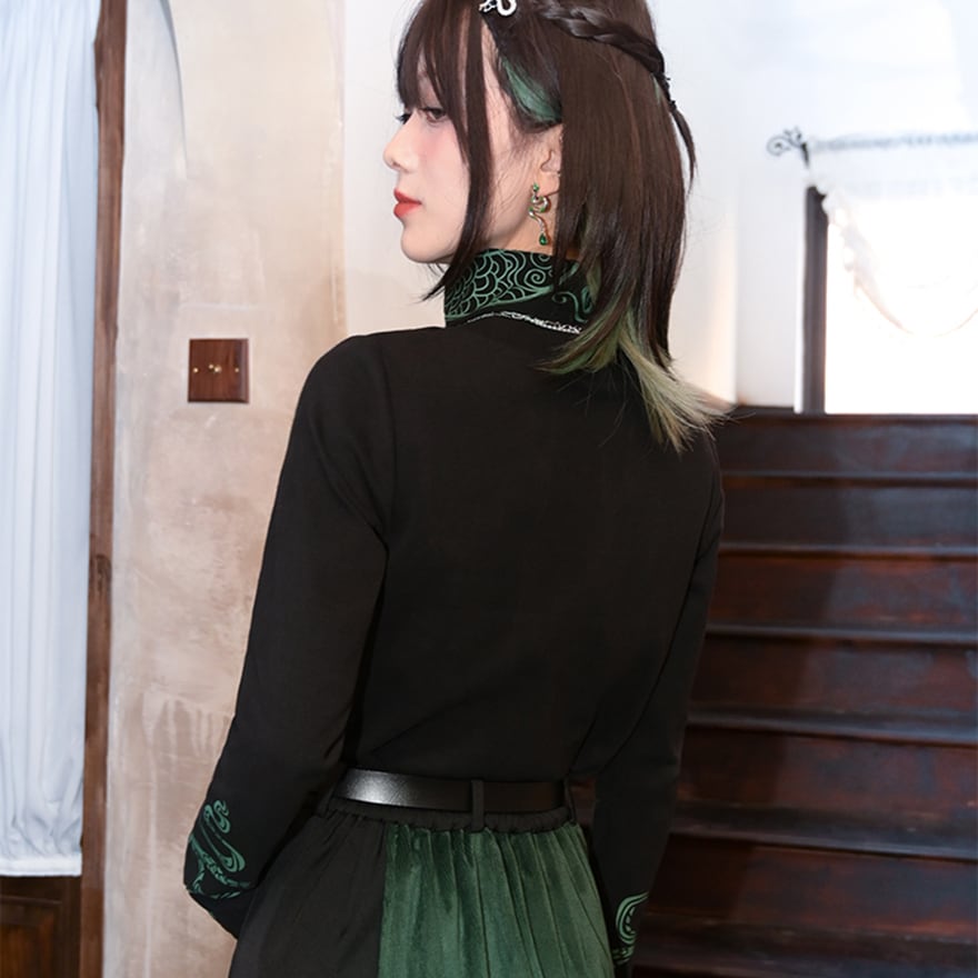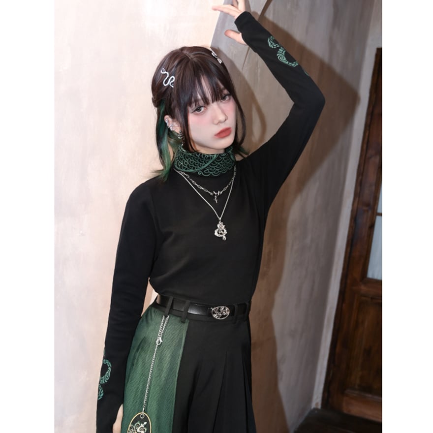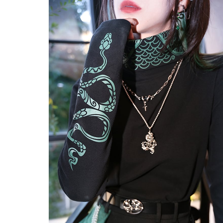 身体にフィットする黒のハイネックTシャツに、首元と両袖に龍をモチーフにしたオリエンタルなプリントが施されています。