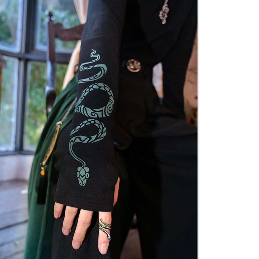 落ち着いたグリーンのプリントが、ダークでミステリアスな雰囲気を醸し出します。