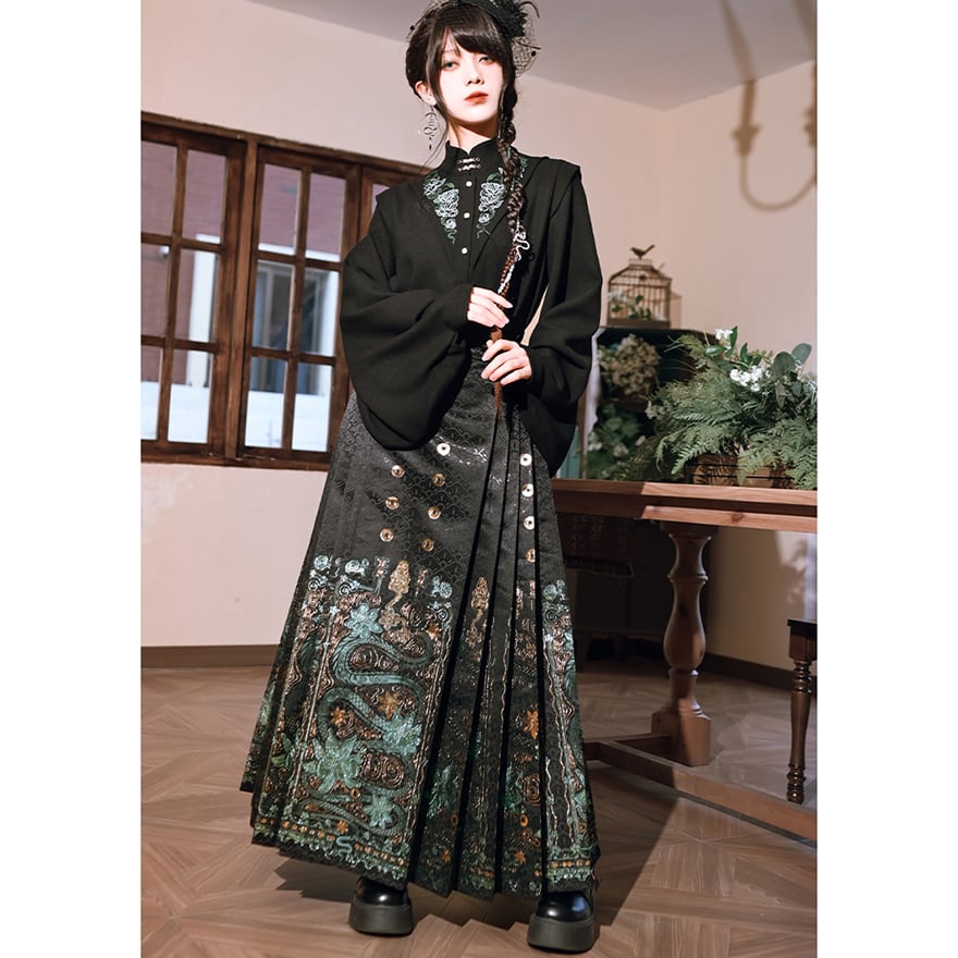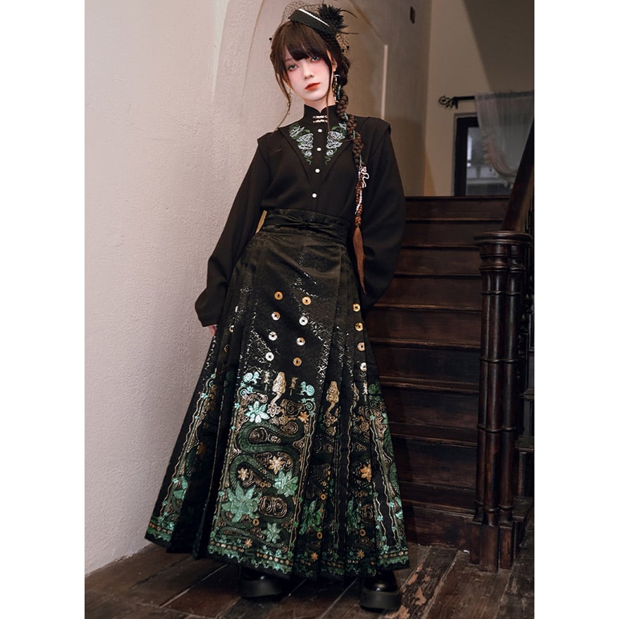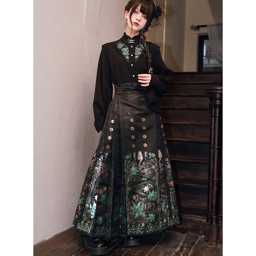 サブカル系 中華ゴシック プリーツ 刺繍 巻きスカート 黒蛇柄 古怪舎