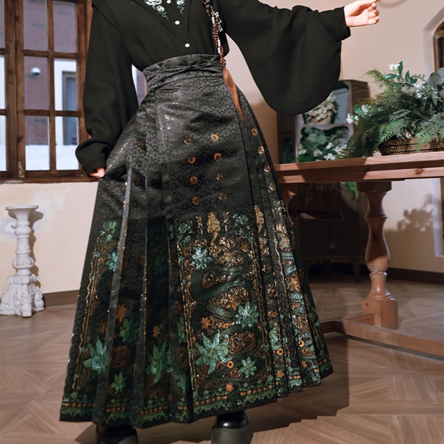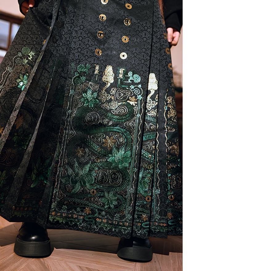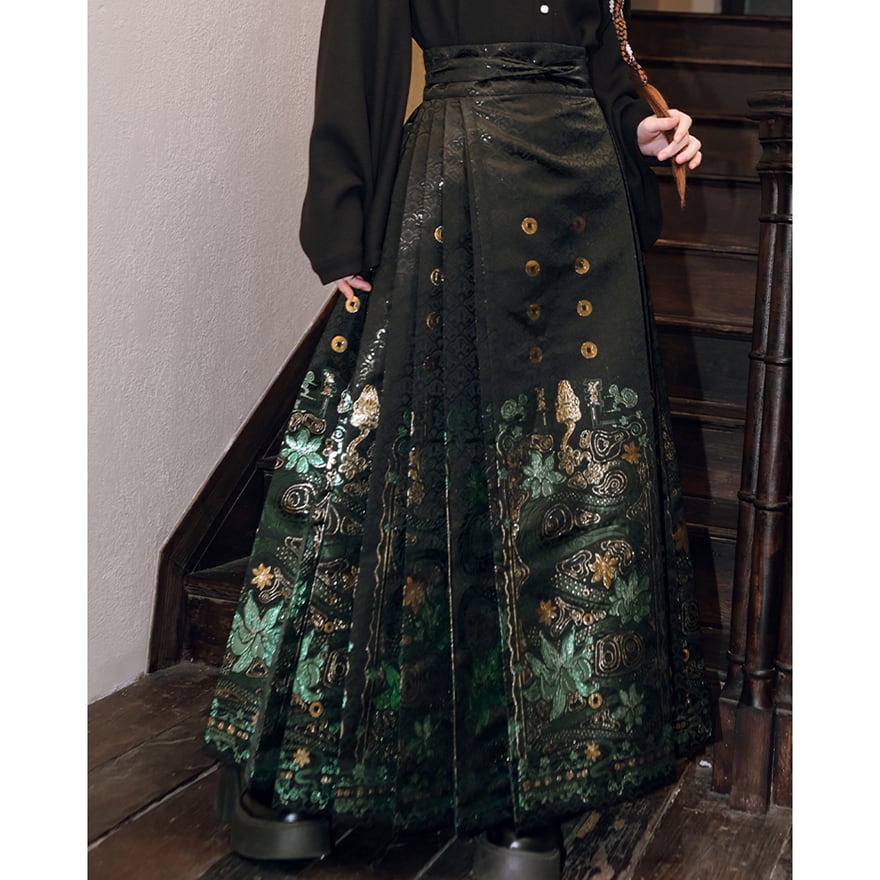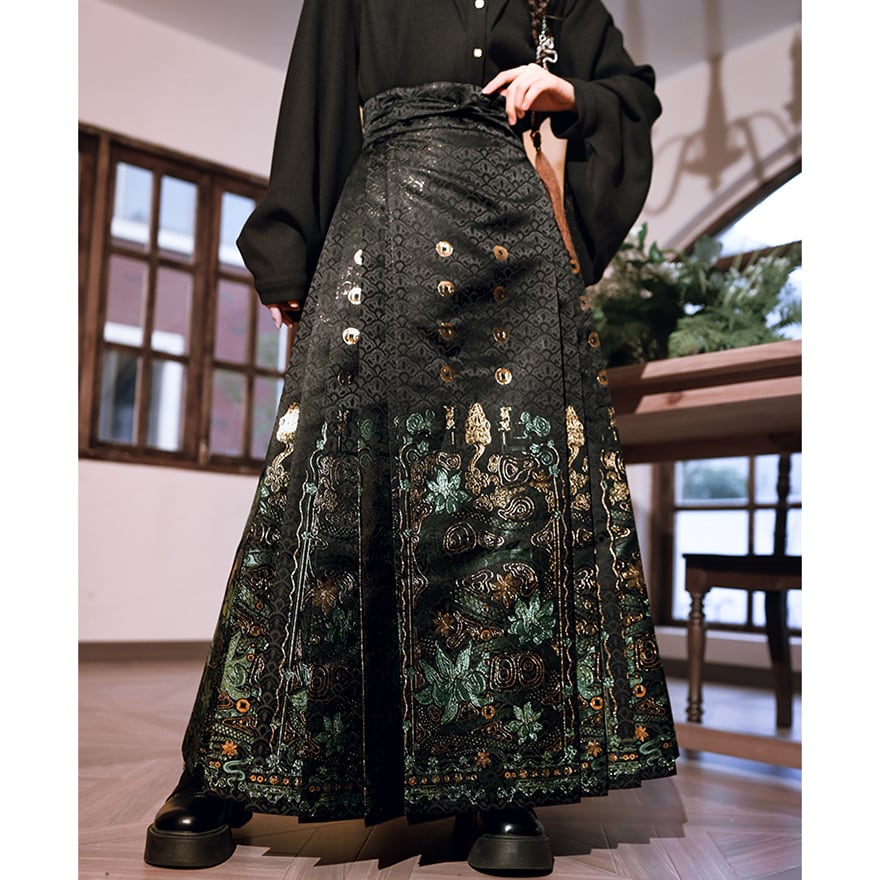 黒を基調としたジャカード生地に、金と翠の糸で蛇や神話的な模様が緻密に織り込まれた、芸術品のようなロングスカートです。