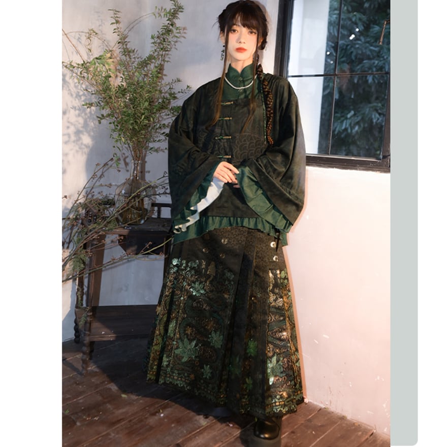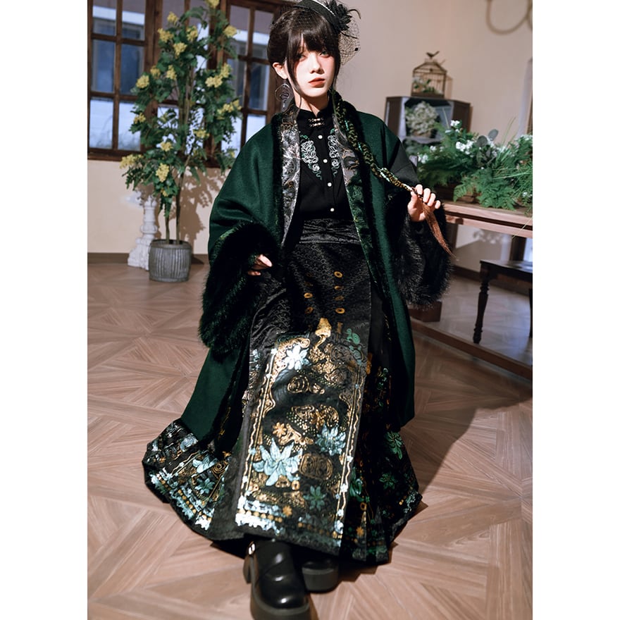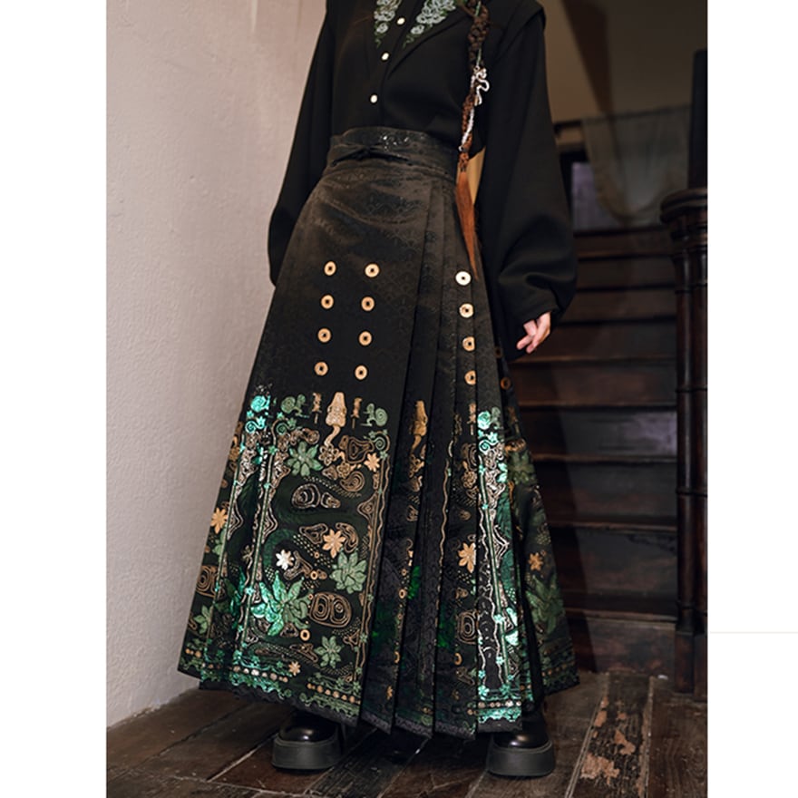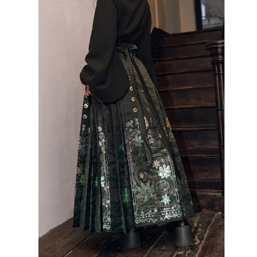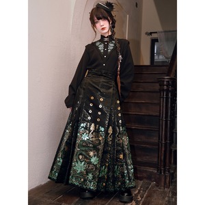 黒を基調としたジャカード生地に、金と翠の糸で蛇や神話的な模様が緻密に織り込まれた、芸術品のようなロングスカートです。