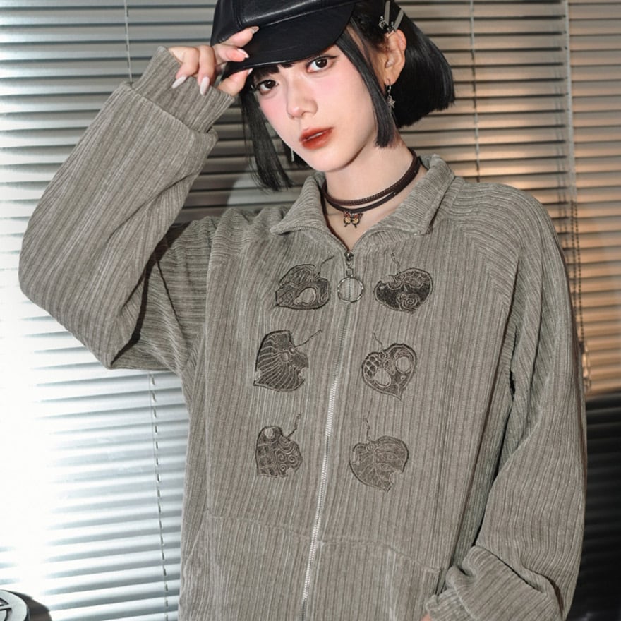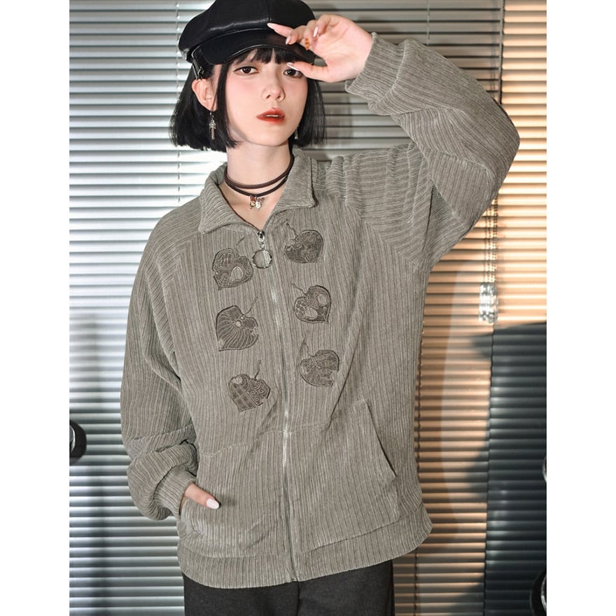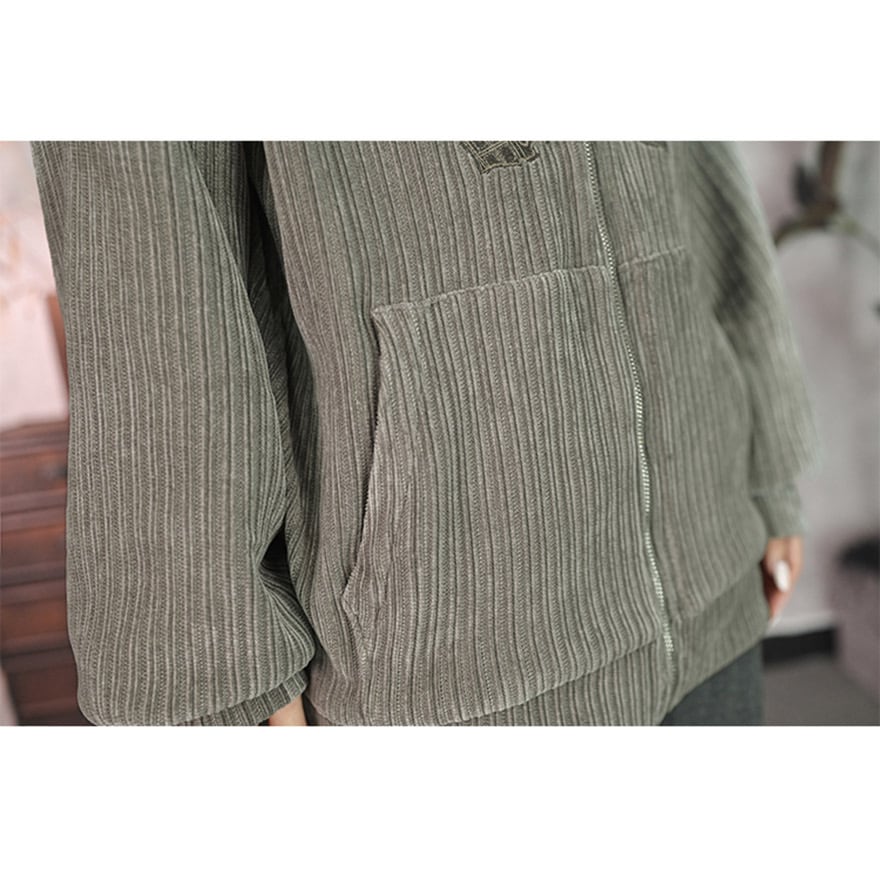 落ち着いたカーキ系のカラーリングに、中華風のレトロな刺繍が目を引くジップアップカーディガンです。