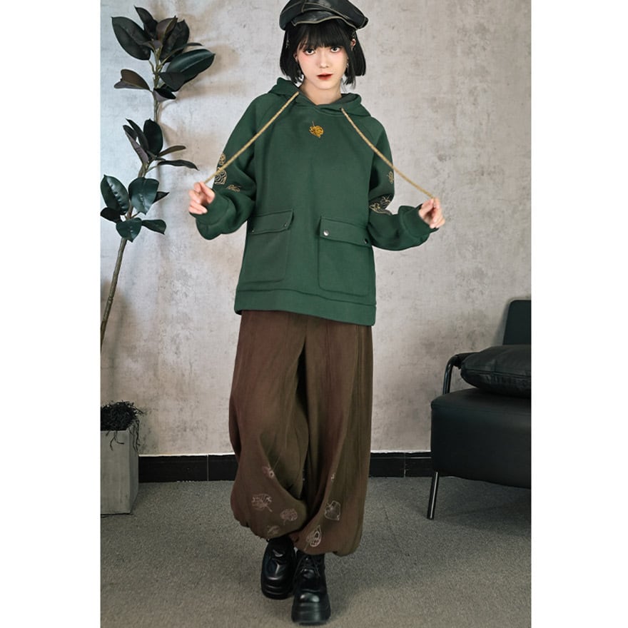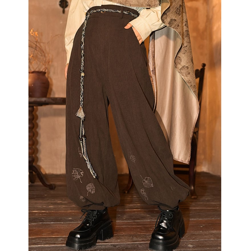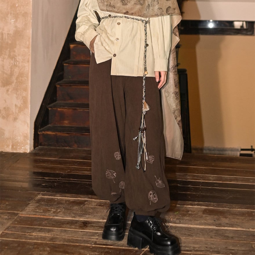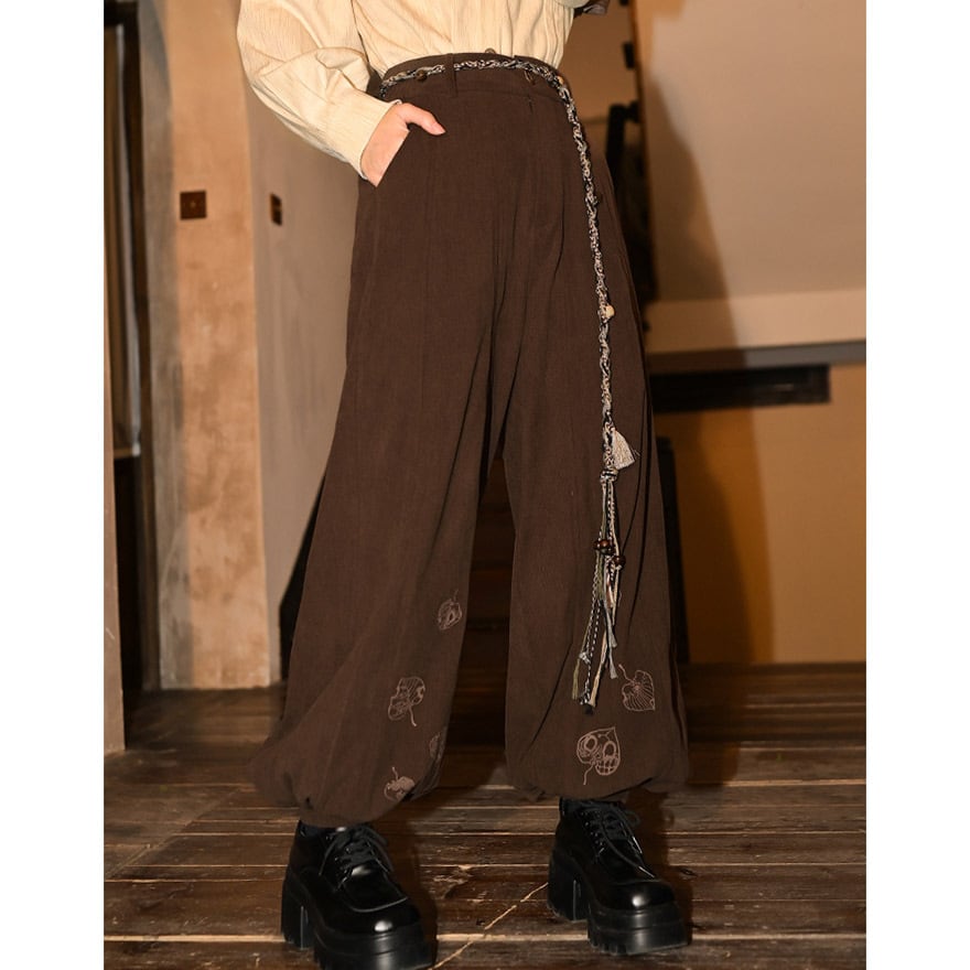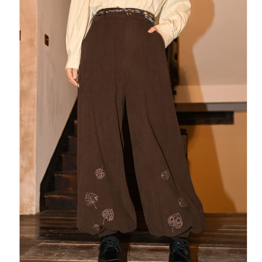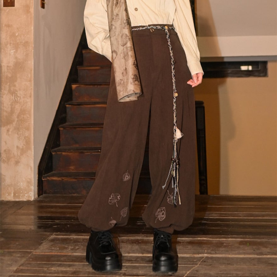 ゆったりとしたワイドなフォルムから、裾をきゅっと絞ったデザインが特徴的。裾にあしらわれた中華風のレトロな葉っぱの刺繍が、さりげないアクセントになっています。