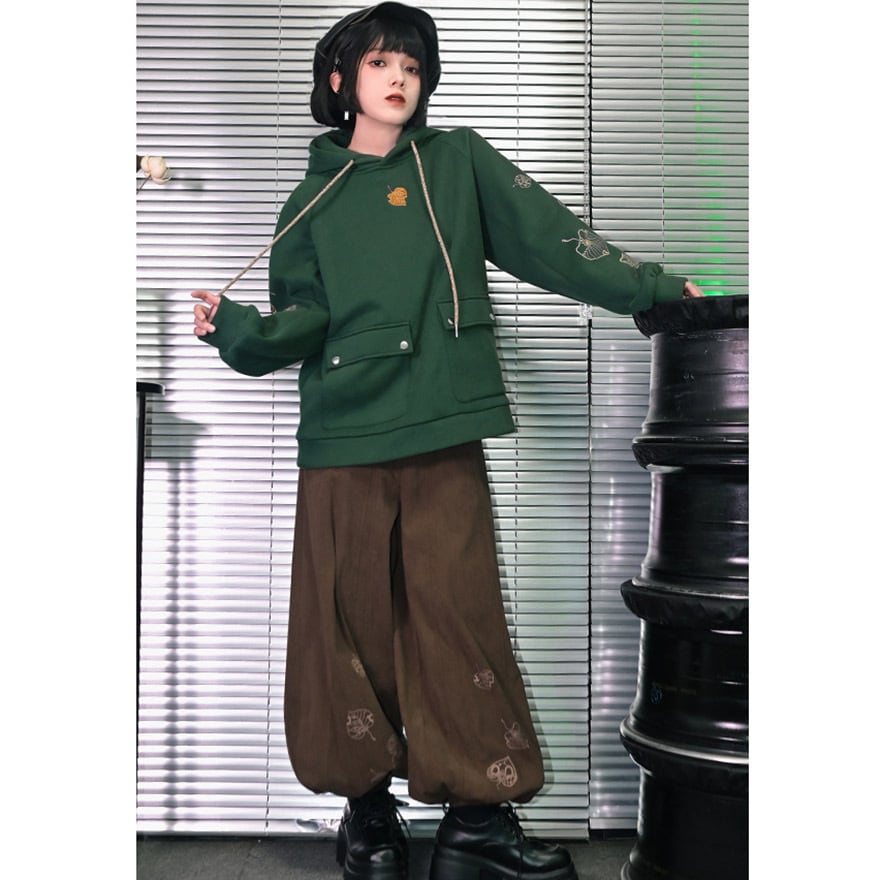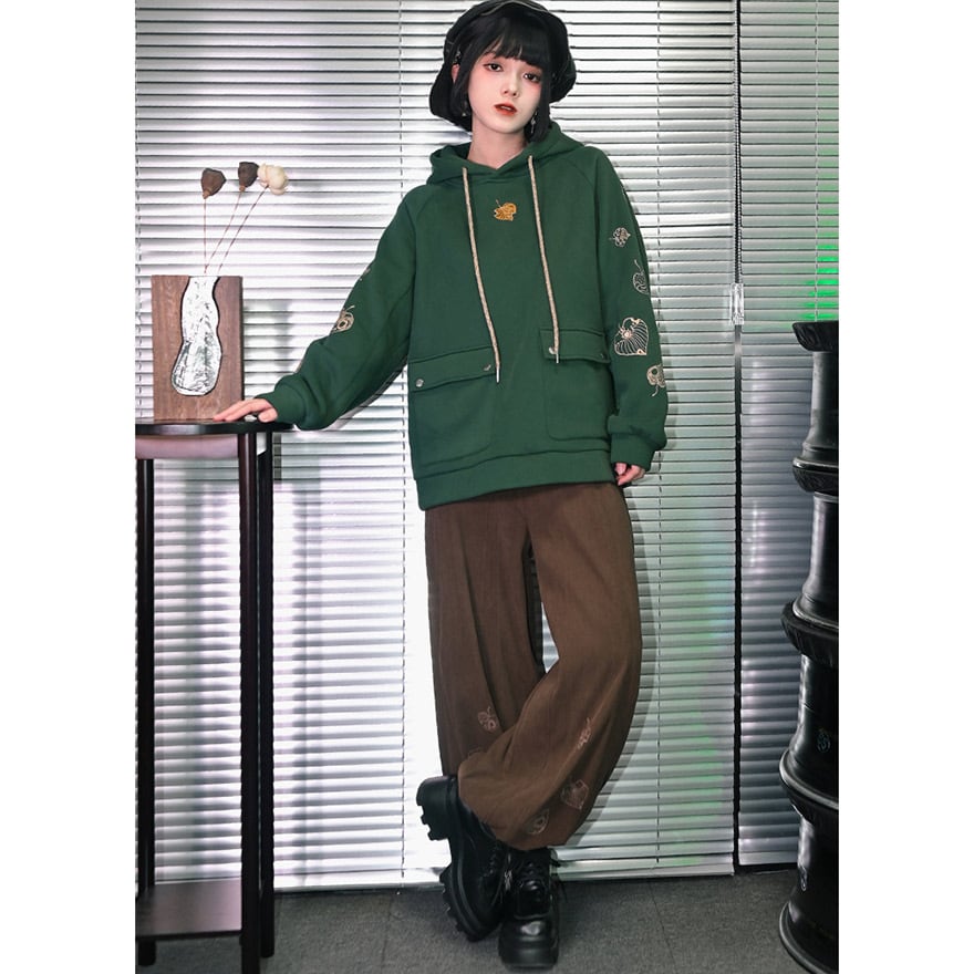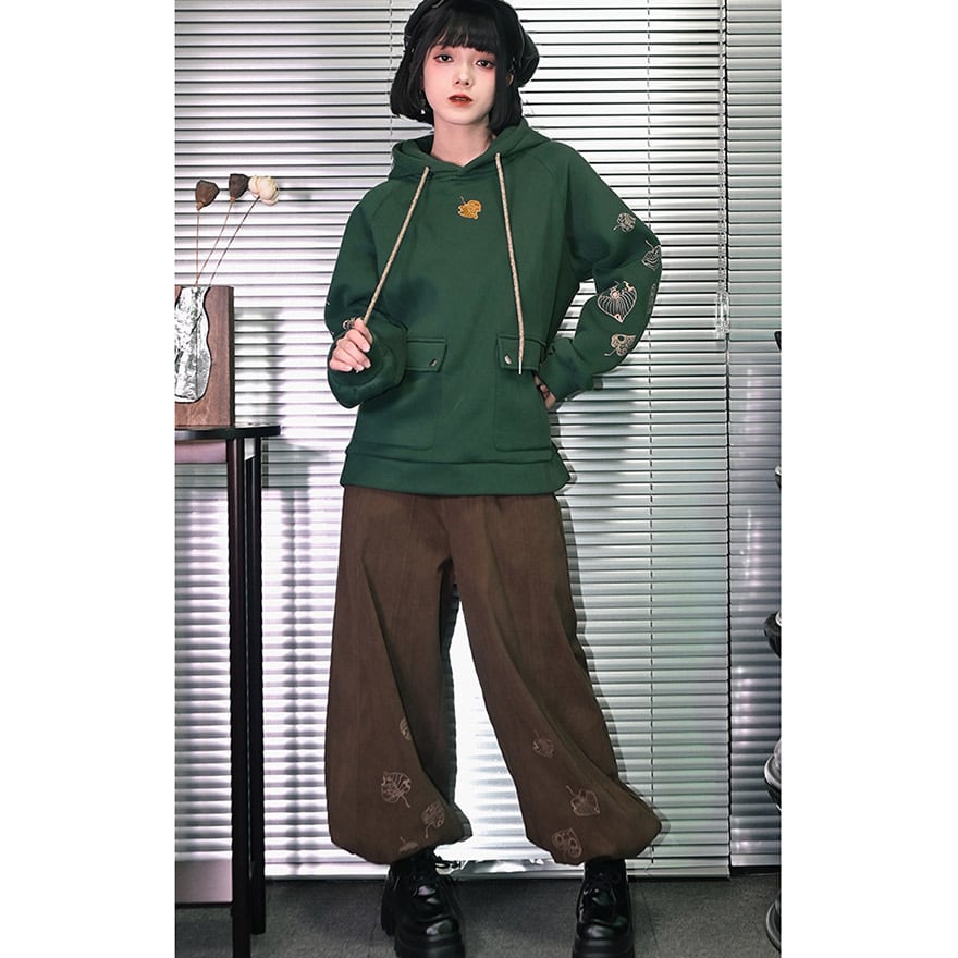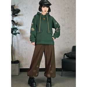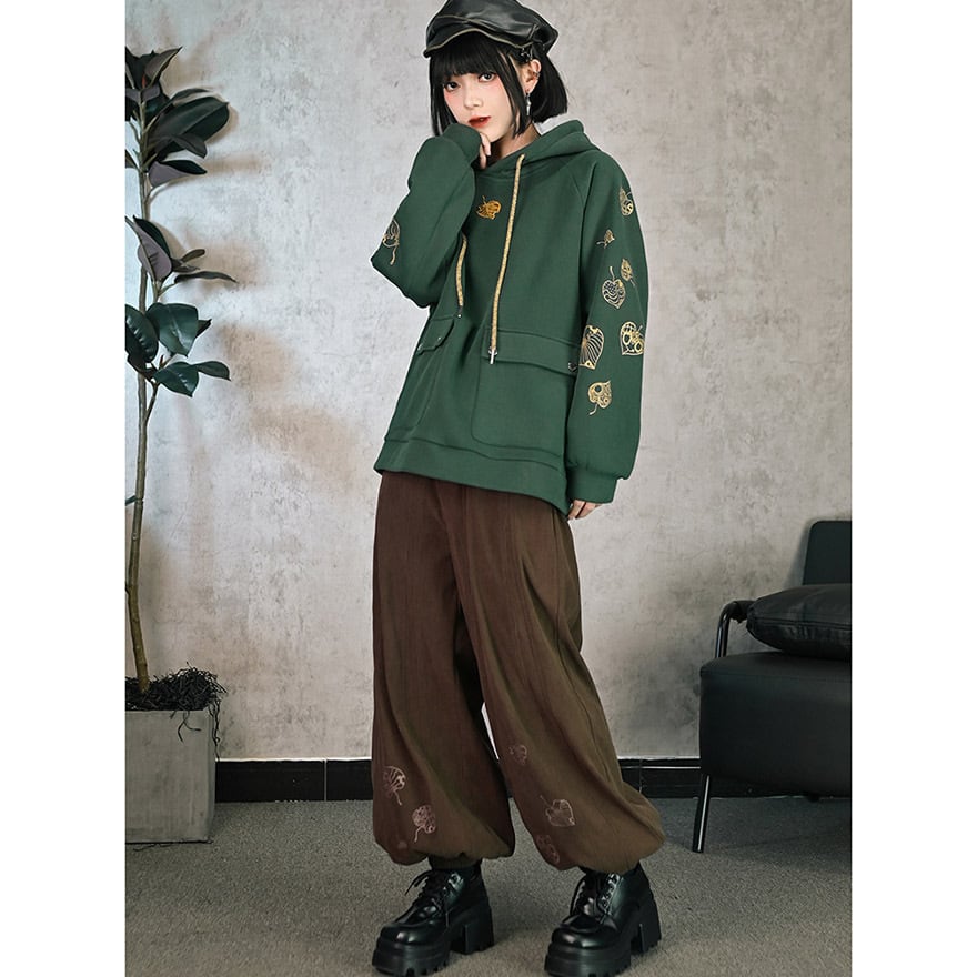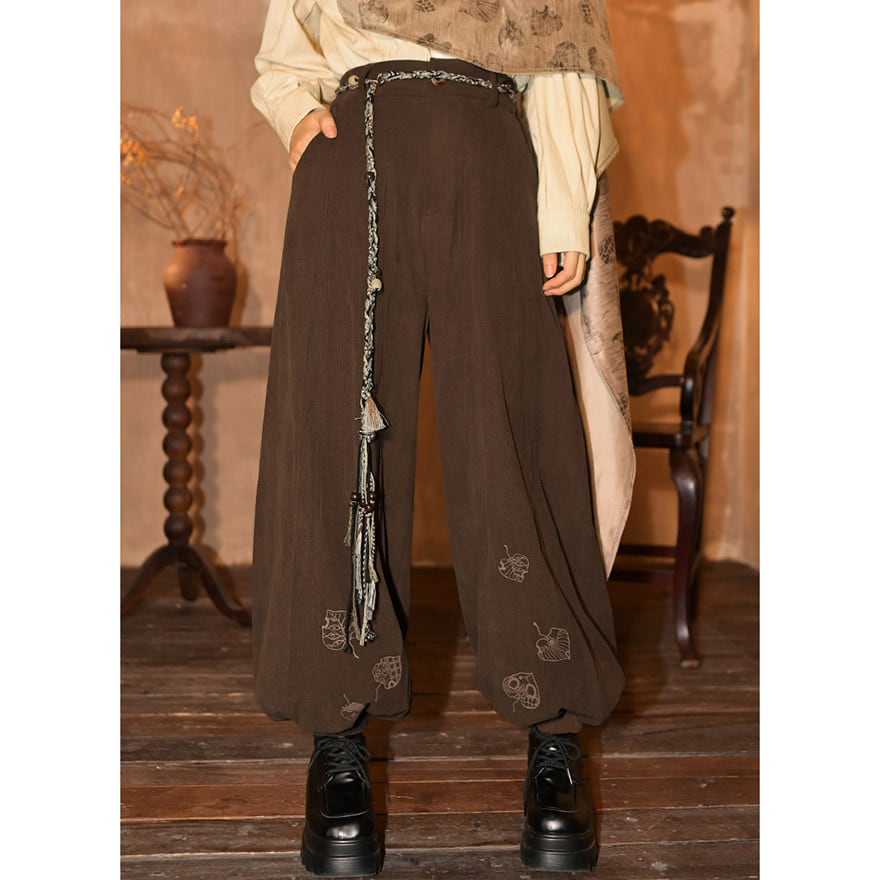 ゆったりとしたワイドなフォルムから、裾をきゅっと絞ったデザインが特徴的。裾にあしらわれた中華風のレトロな葉っぱの刺繍が、さりげないアクセントになっています。