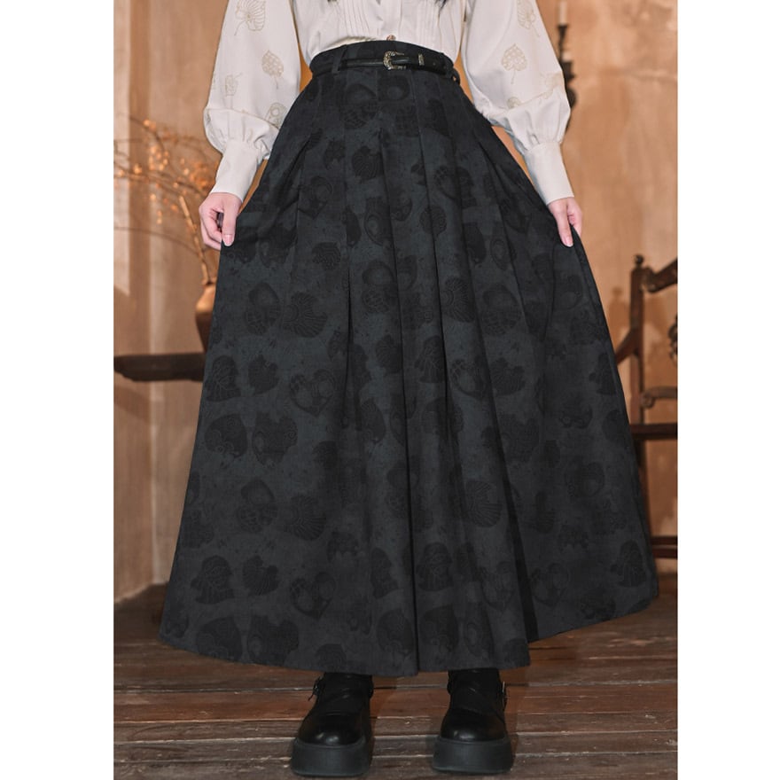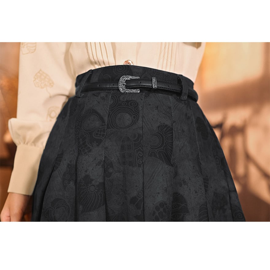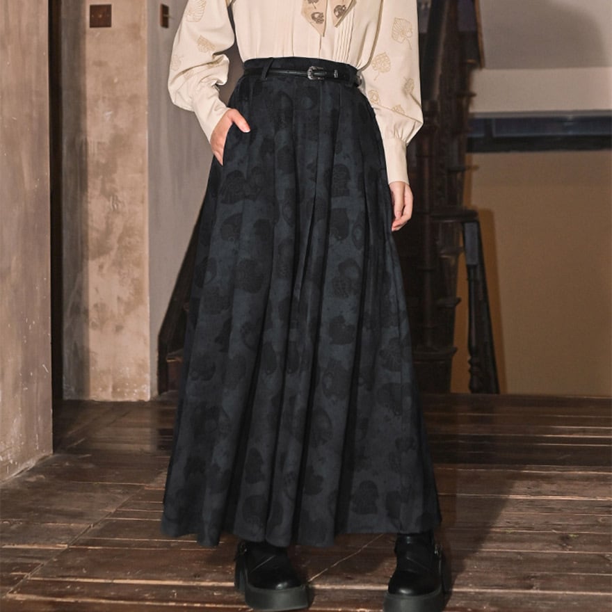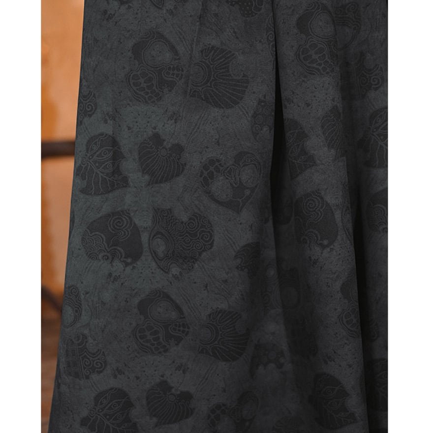 ダークなカラーリングの生地に、同色系で中華風のユニークなモチーフがプリントされた、個性的なプリーツスカートです。
