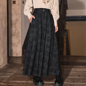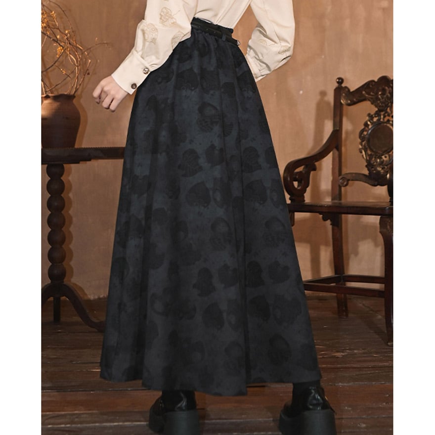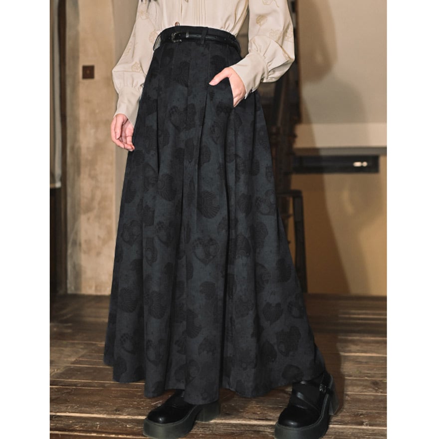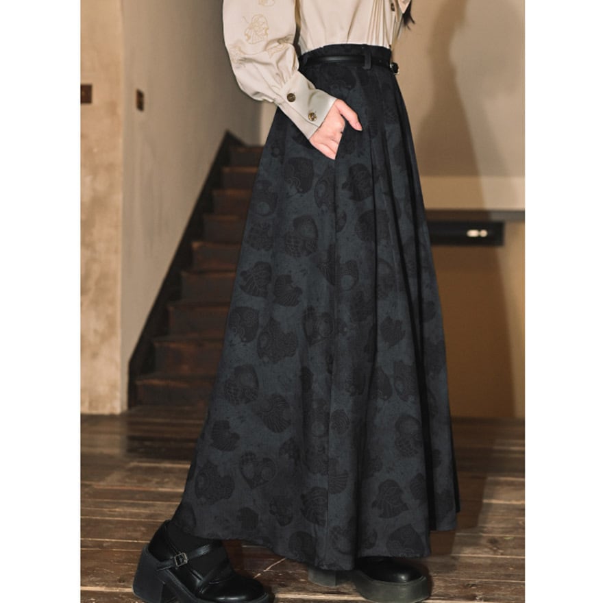 さりげないプリントながら、独特の世界観を放つスカートは、中華風とサブカルチャーが融合したミステリアスな魅力を持っています。
