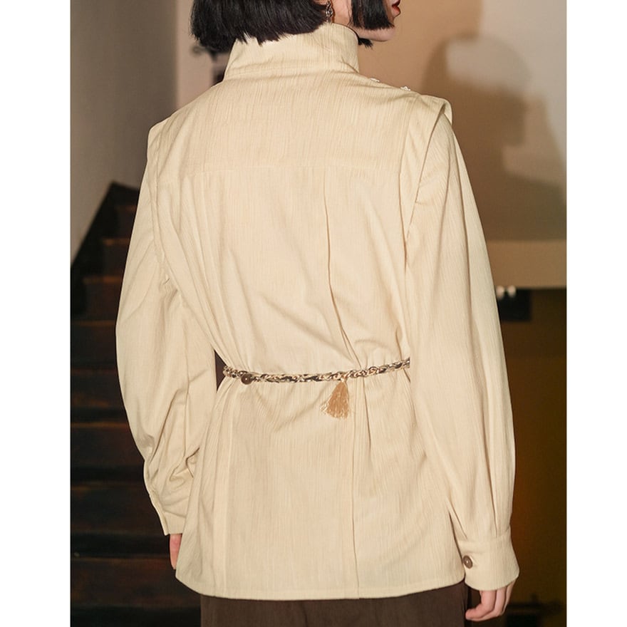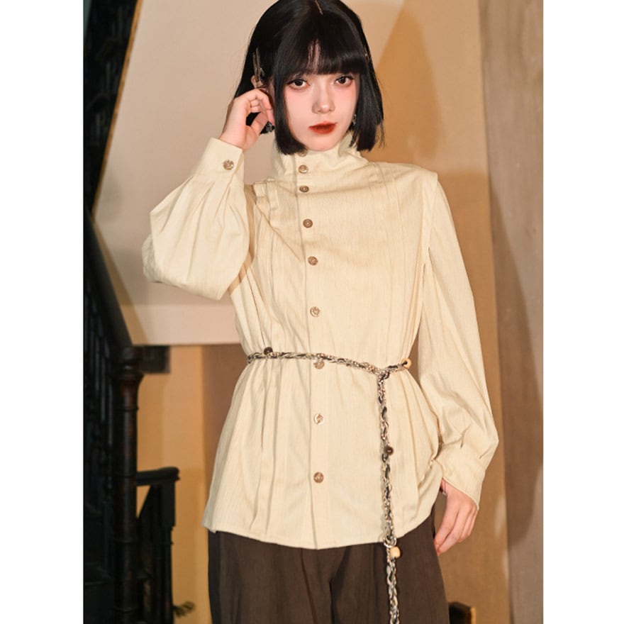 スタンドカラーとアシンメトリーなデザインが特徴的な、クリーム色のシャツです。