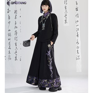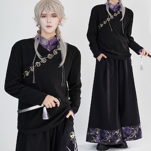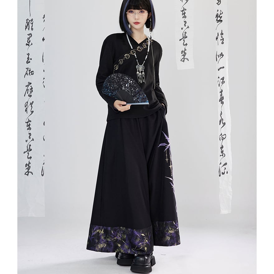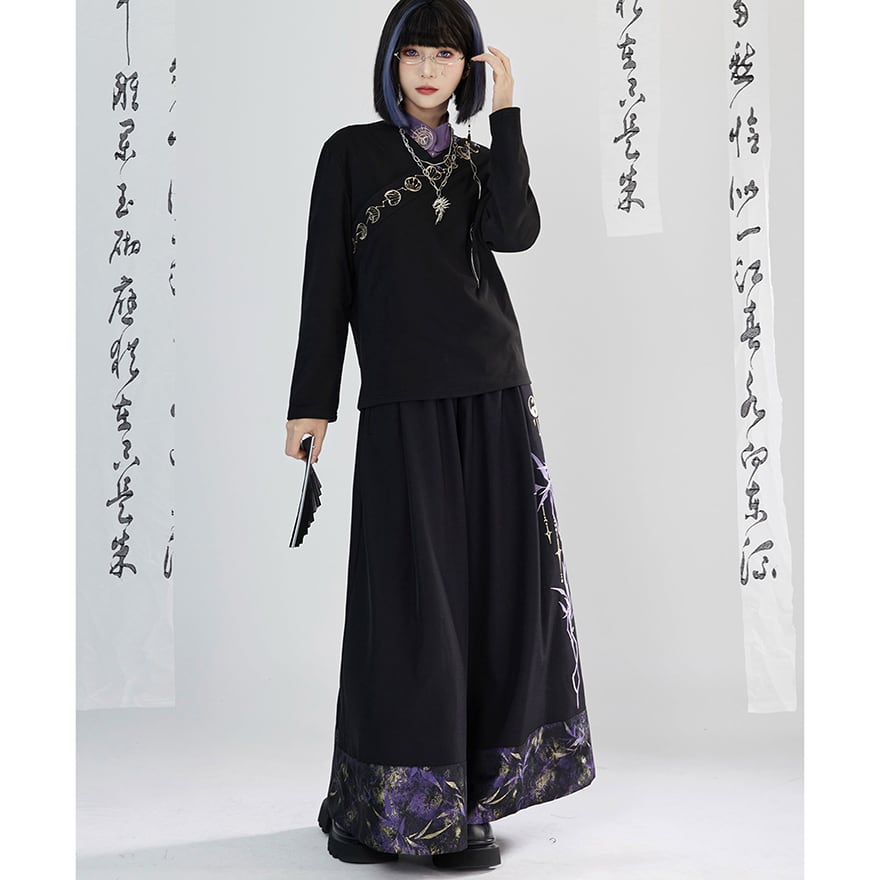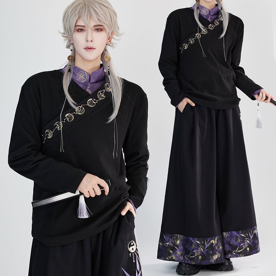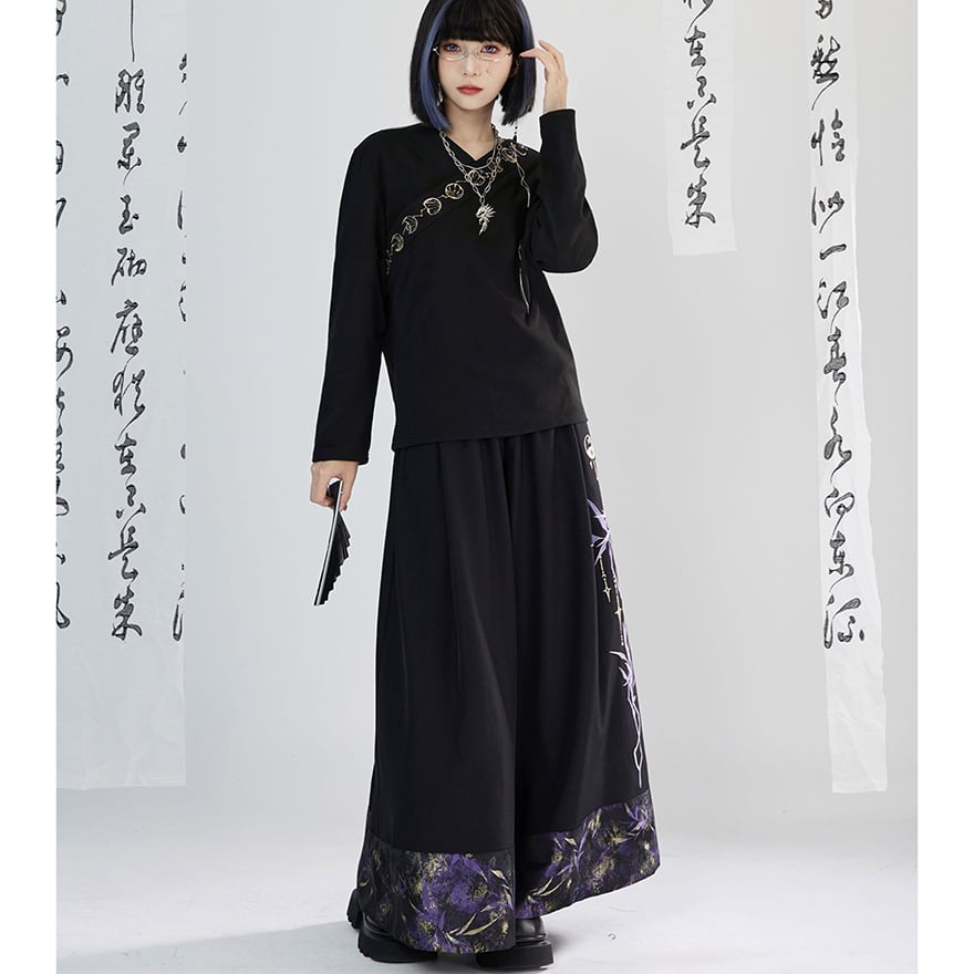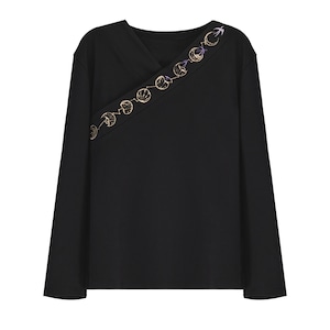 黒のシンプルな生地に、胸元を斜めに横切る月の満ち欠けを表現した金色の刺繍が映える、中華風の長袖トップスです。