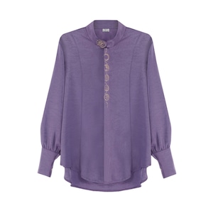 深みのある紫色の生地に、同色のジャガード織りが上品な陰影を与える長袖シャツです。