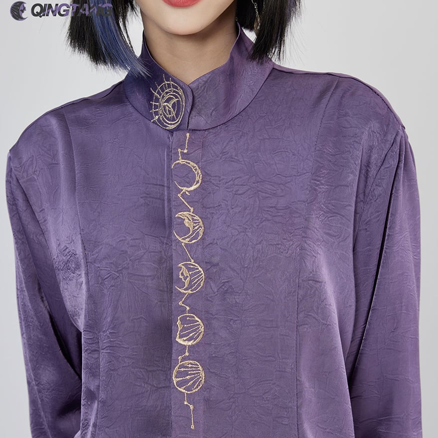 胸元には、月の満ち欠けを表現した金色の刺繍が縦のラインを飾り、アシンメトリーなチャイナボタンがアクセントになっています。