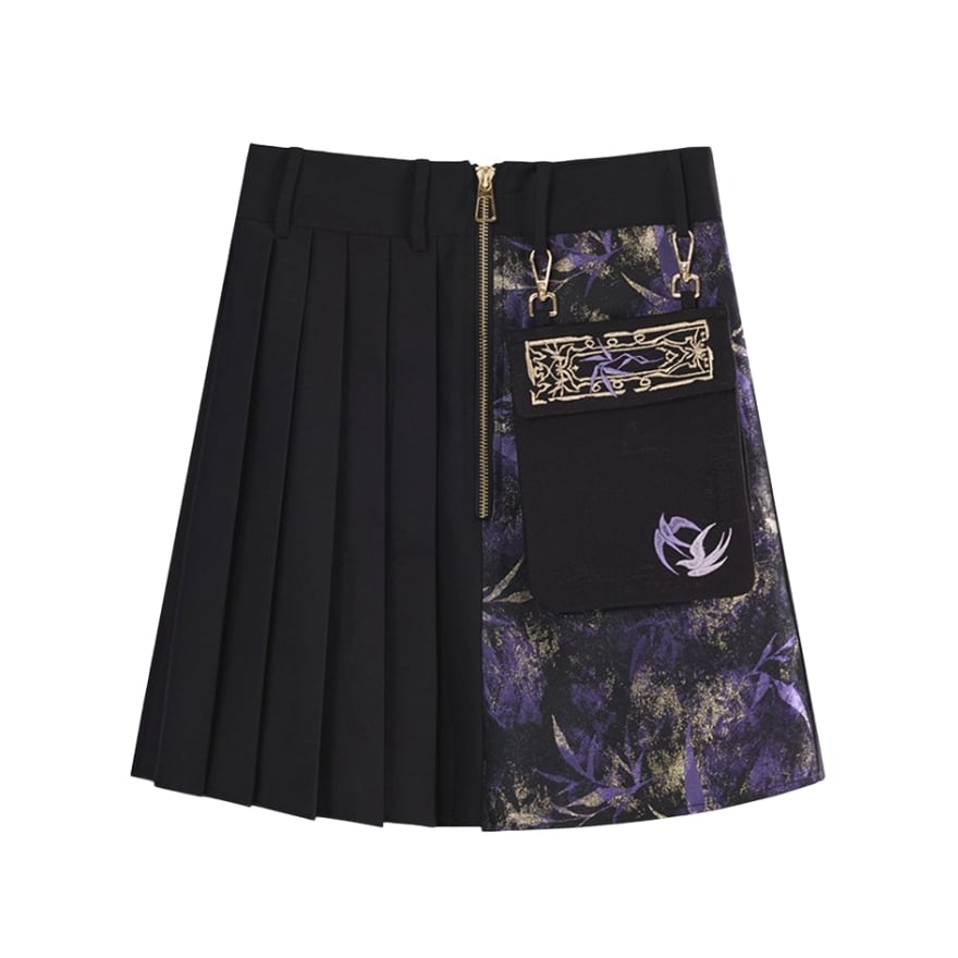 黒のプリーツと、紫と金を基調とした柄生地を大胆に組み合わせたアシンメトリーデザインが特徴のミニスカートです。