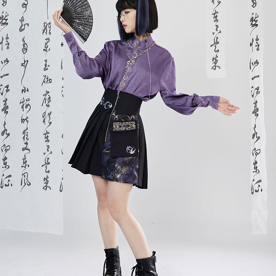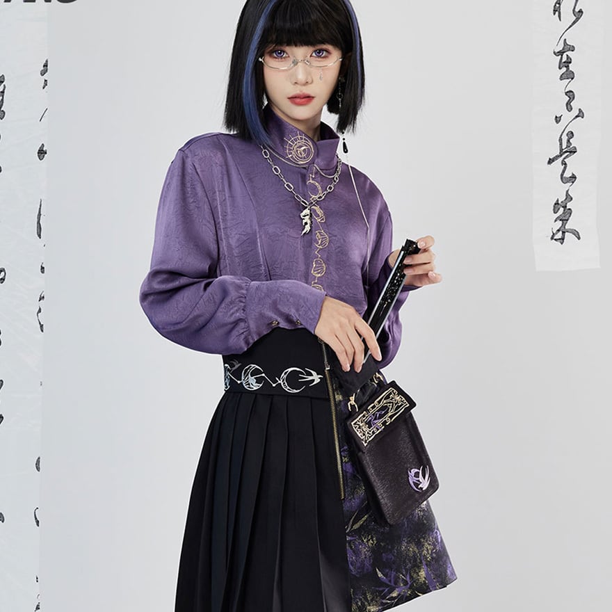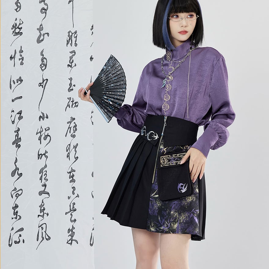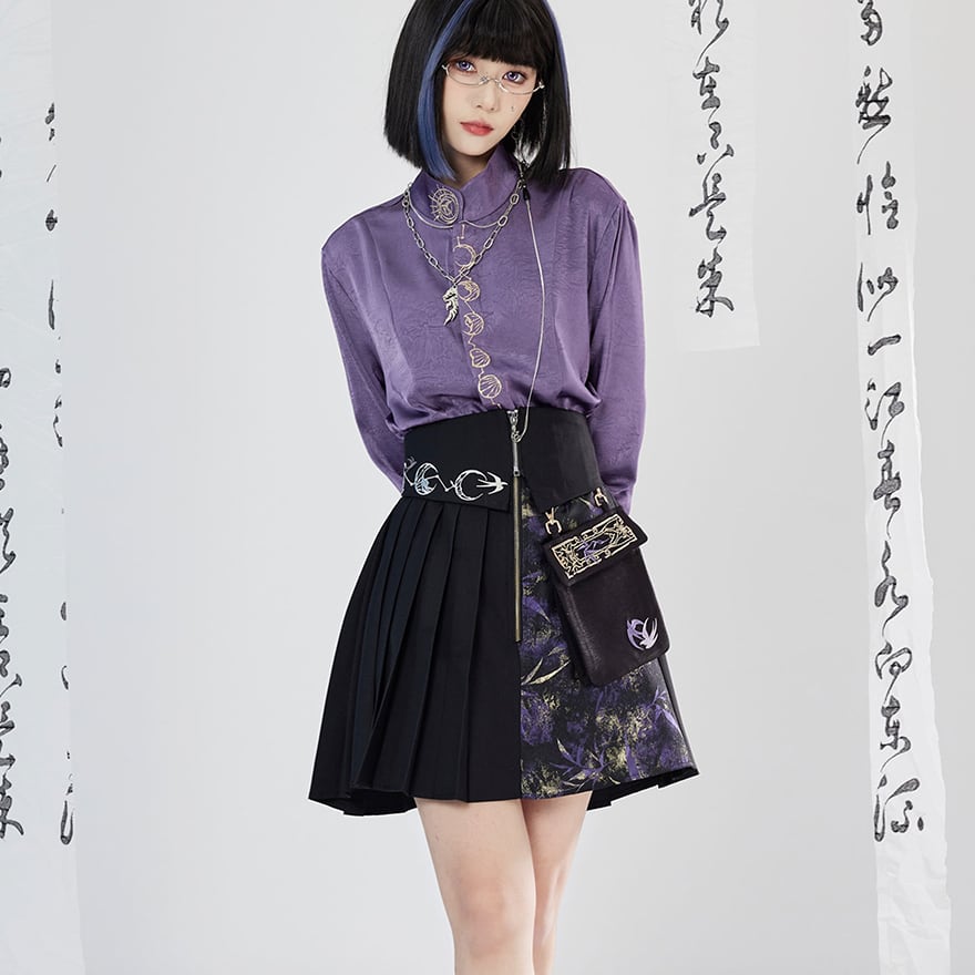 中華風の優雅な刺繍と、ジッパーの無機質な輝きの組み合わせが絶妙なバランスを生み出します。