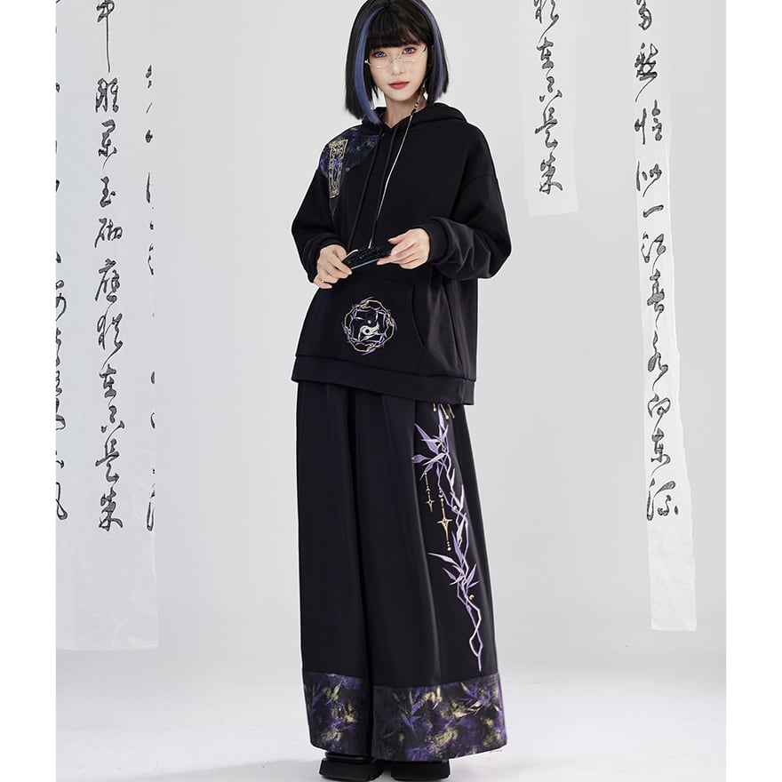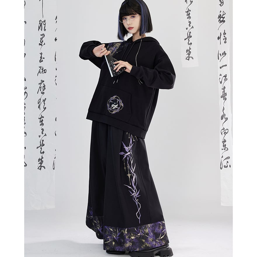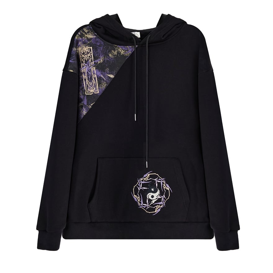 カジュアルなフーディーに、陰陽師や道士を彷彿とさせるダークで幻想的なデザインを落とし込んだ、唯一無二の一着。