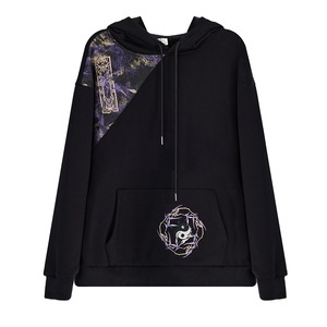 黒のフーディーをベースに、肩口に大胆に切り替えられた紫と金の柄生地がミステリアスな雰囲気を放ちます。