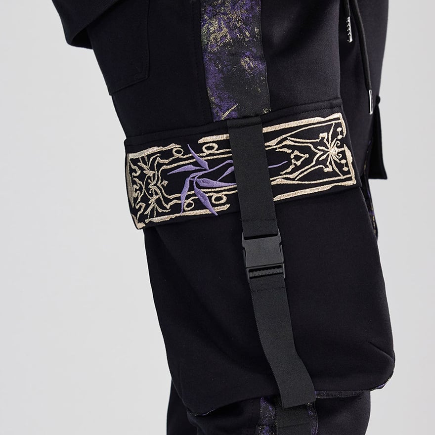 黒のカーゴパンツをベースに、サイドの大きなポケットに紫と金を基調としたミステリアスな柄生地を配した、ストリート感あふれる一本です。