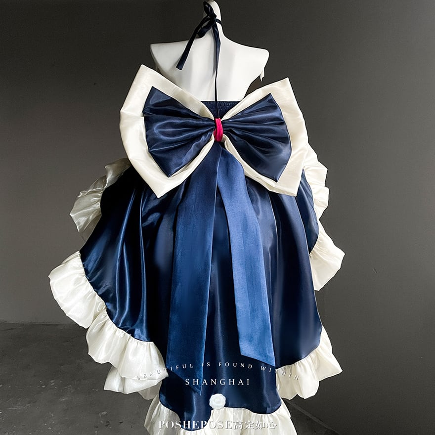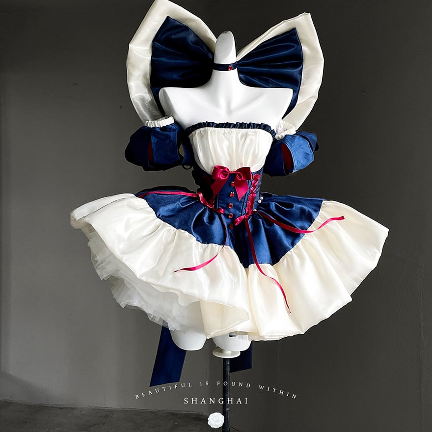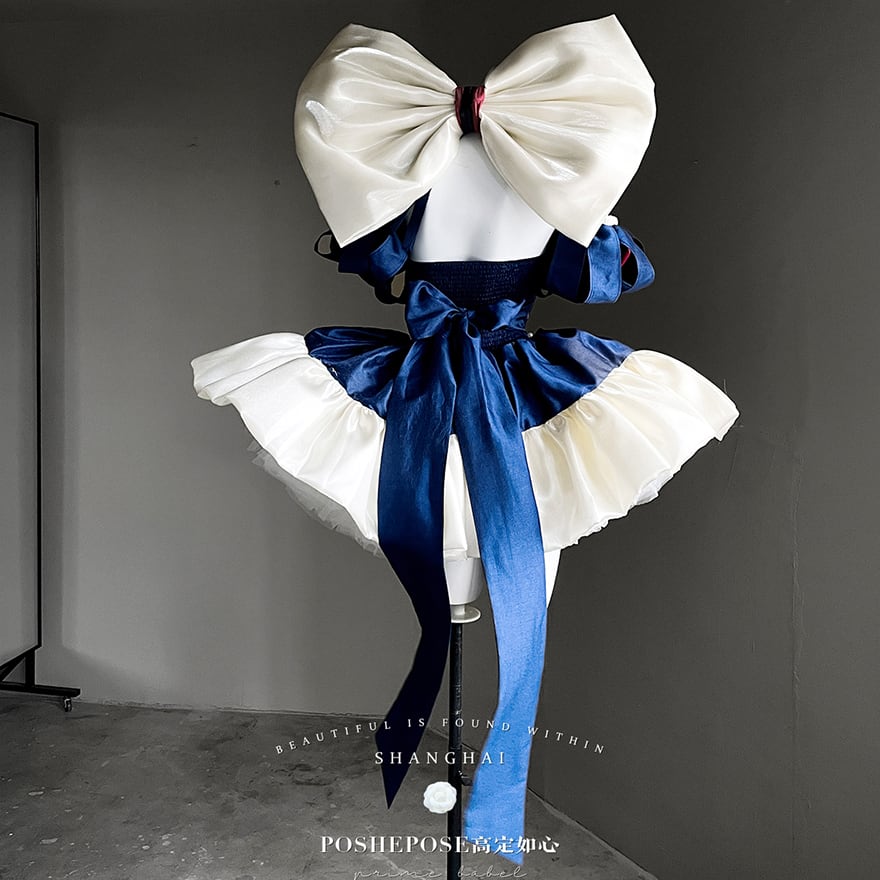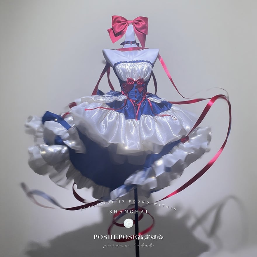 背中の大きなリボンや、取り外し可能なトレーン、お揃いの手袖やチョーカーまでセットになっており、これ一着で完璧なプリンセススタイルが完成します。