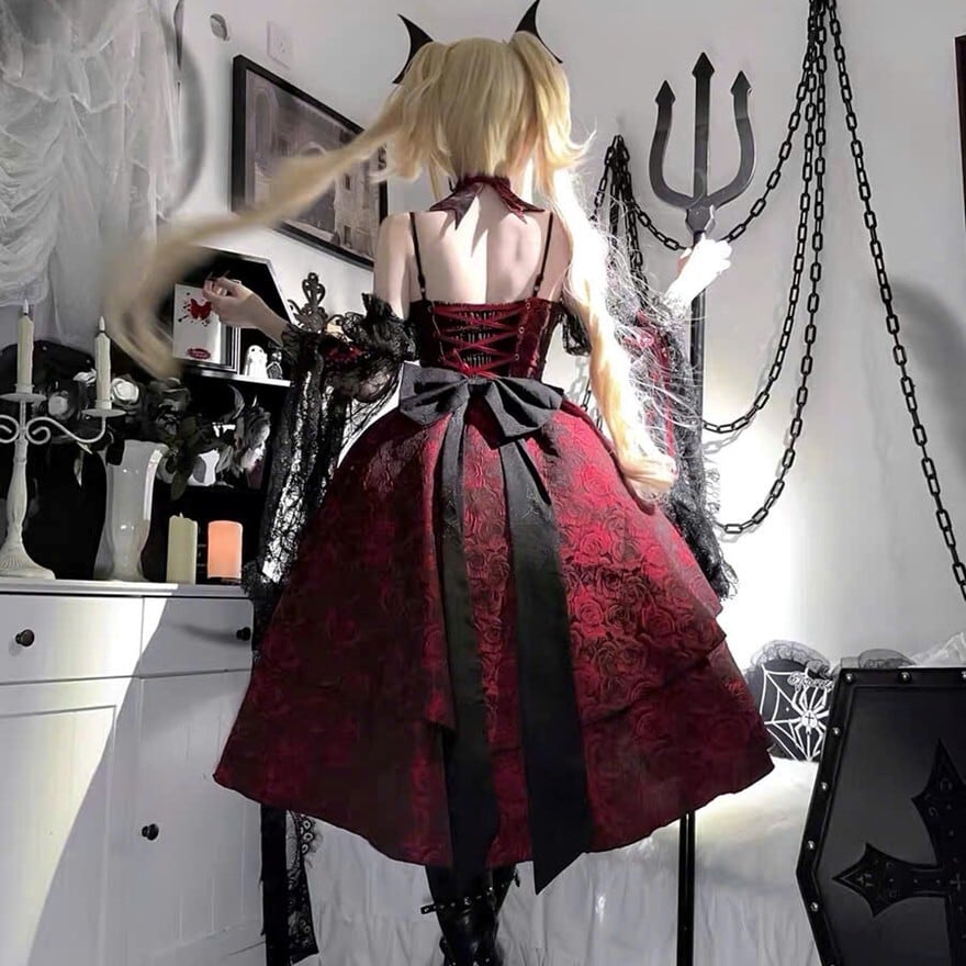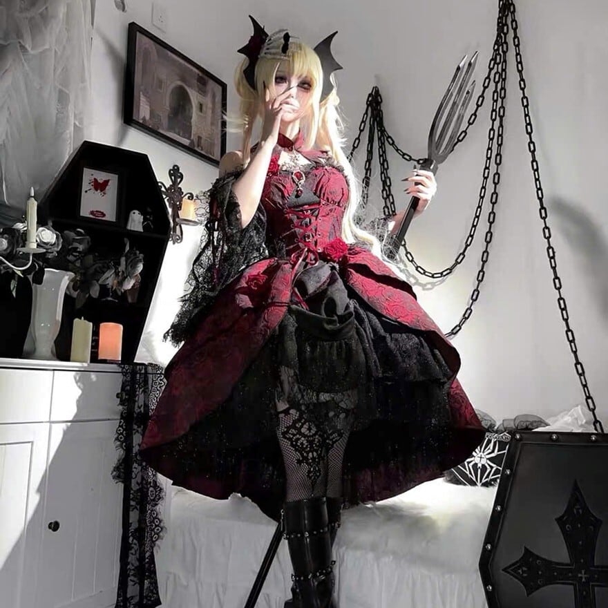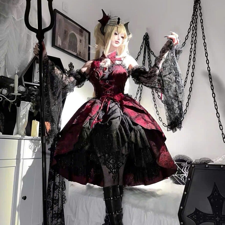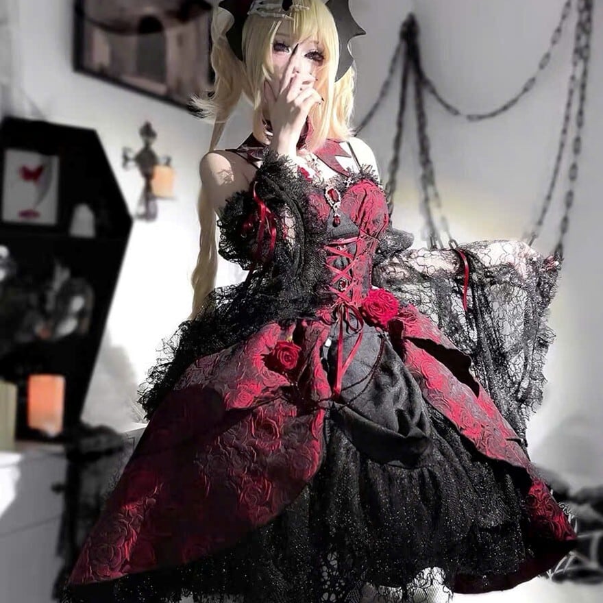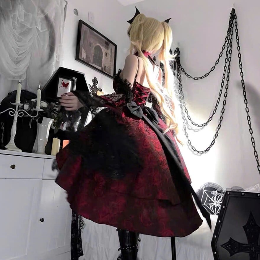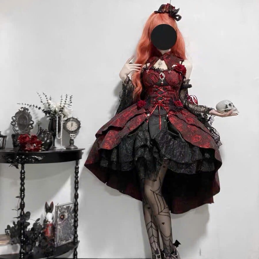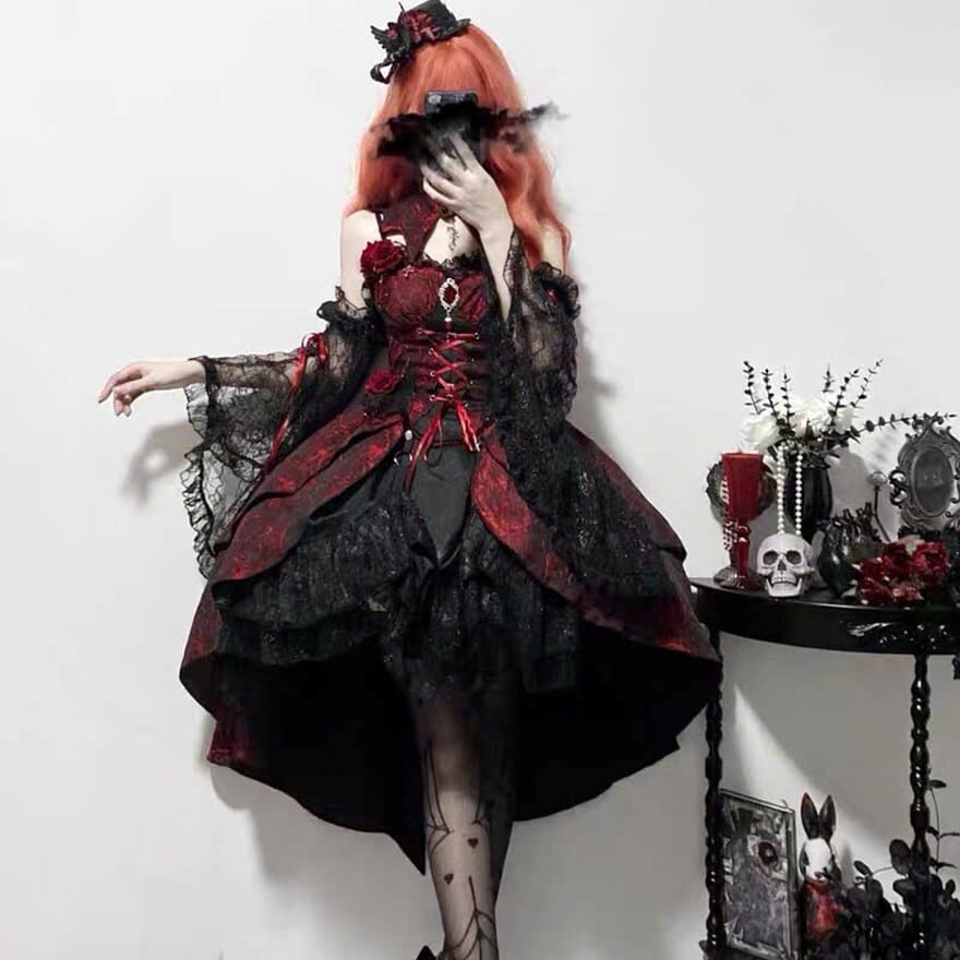 このドレスは、贅沢な布量を使用したレイヤードフレア構造により、どこから見ても隙のない華やかなシルエットを実現しました。地雷系・サブカル系初心者の方でも、袖やチョーカーまで揃ったフルセットなので、コーディネートに迷うことなく、完成度の高いゴシックスタイルを完成させることができます。