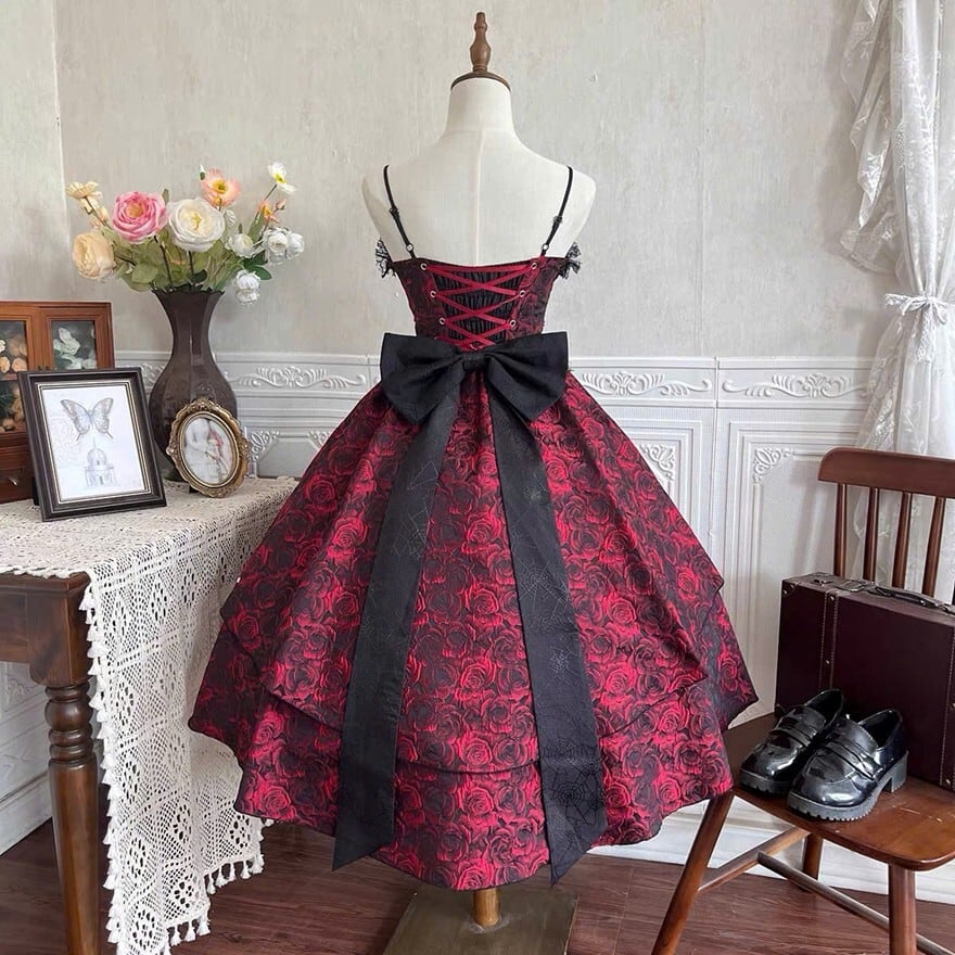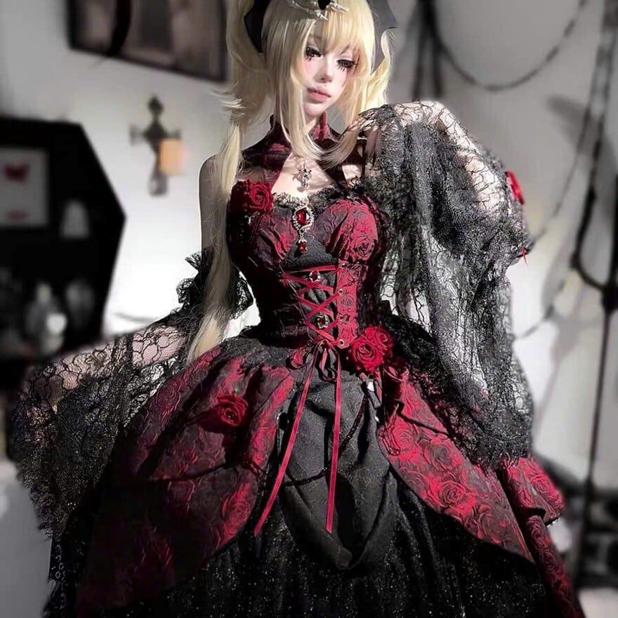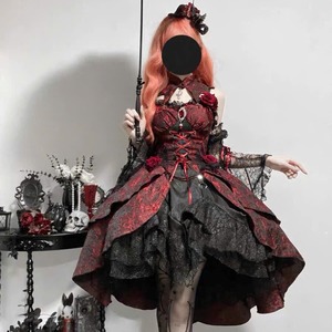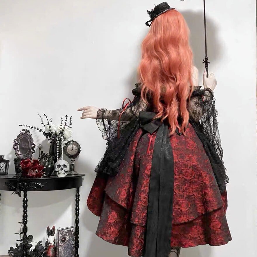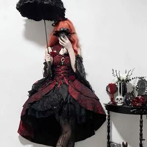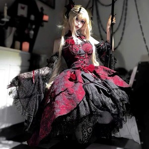 豪華な薔薇柄ジャガードと繊細な黒レースを幾重にも重ねた、圧倒的なボリュームのレイヤードフレアシルエットが魅力の本格ゴシックドレスです。