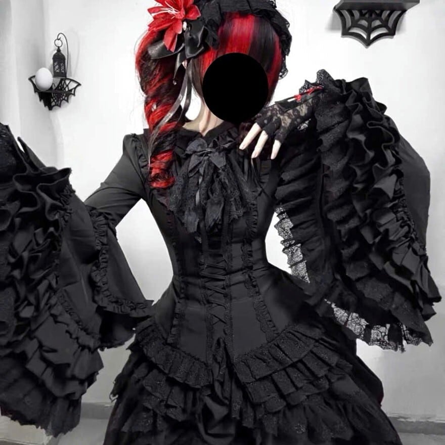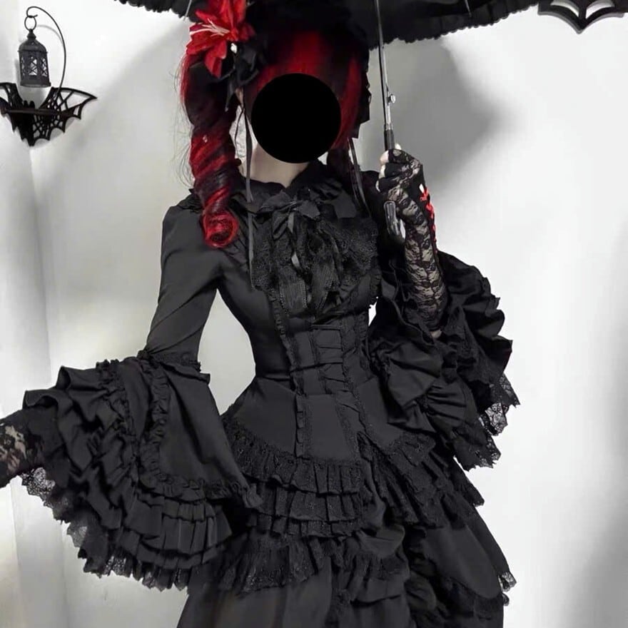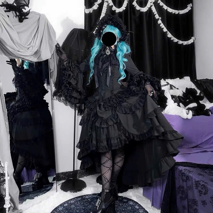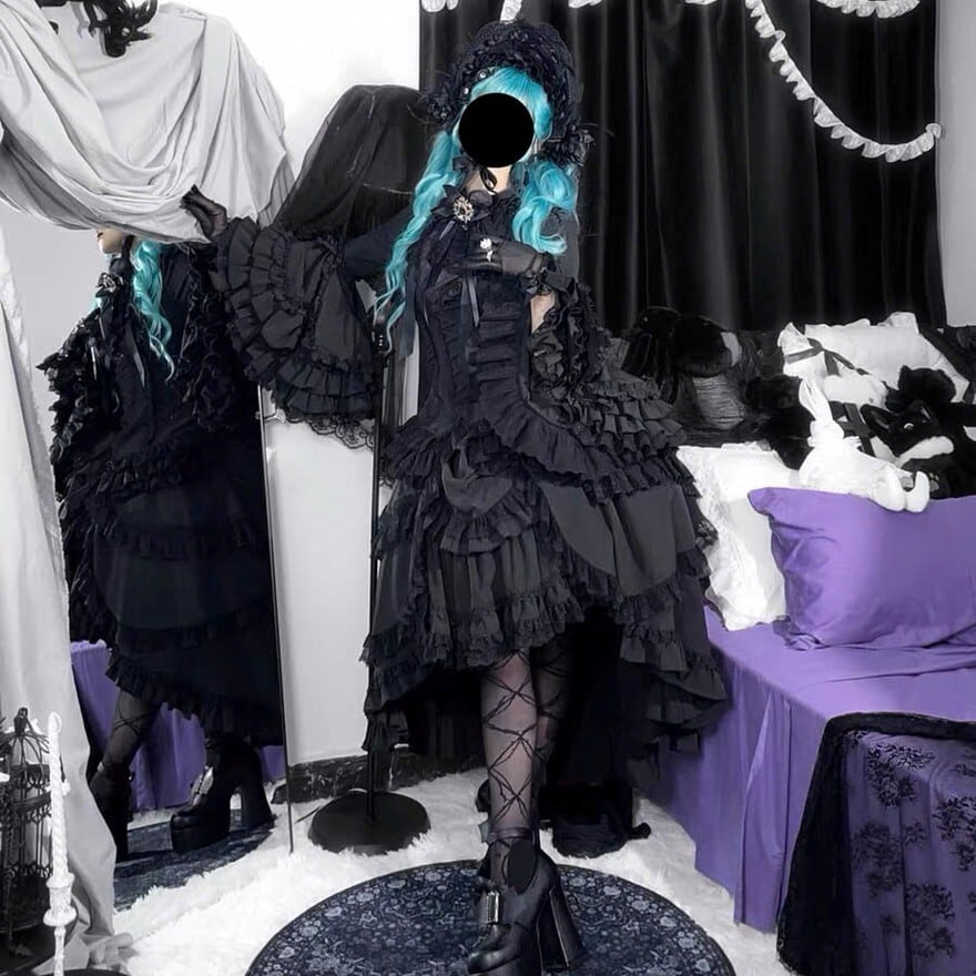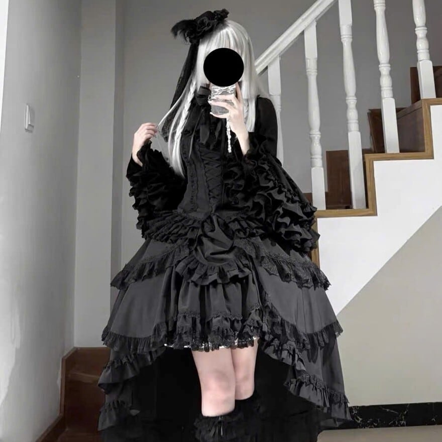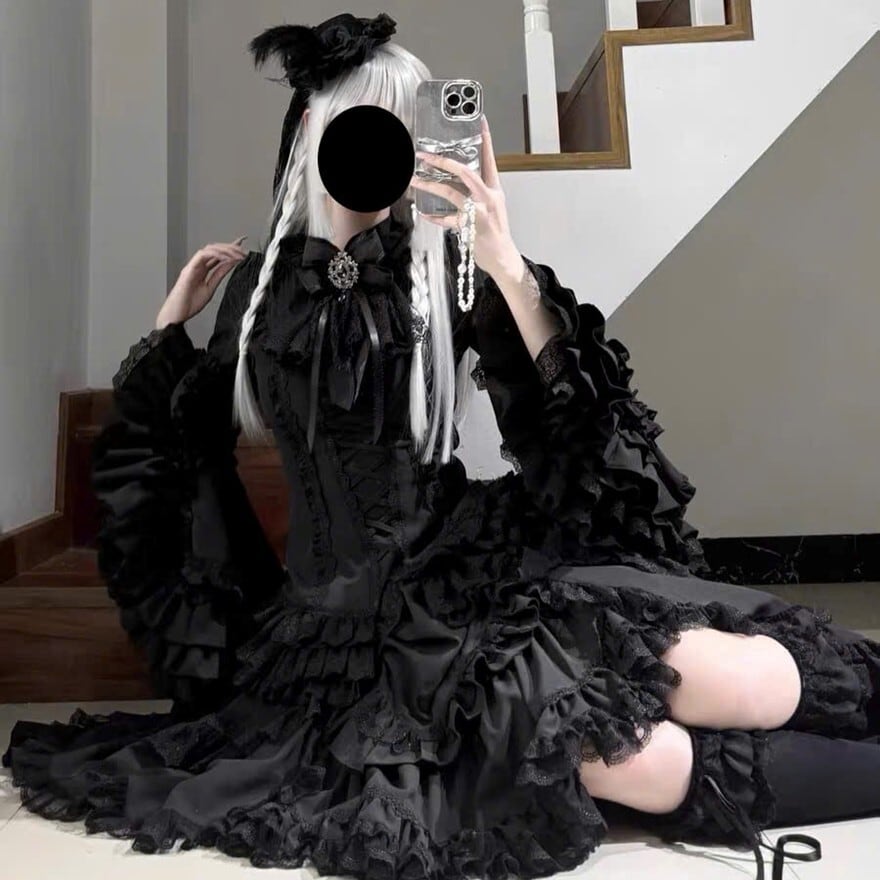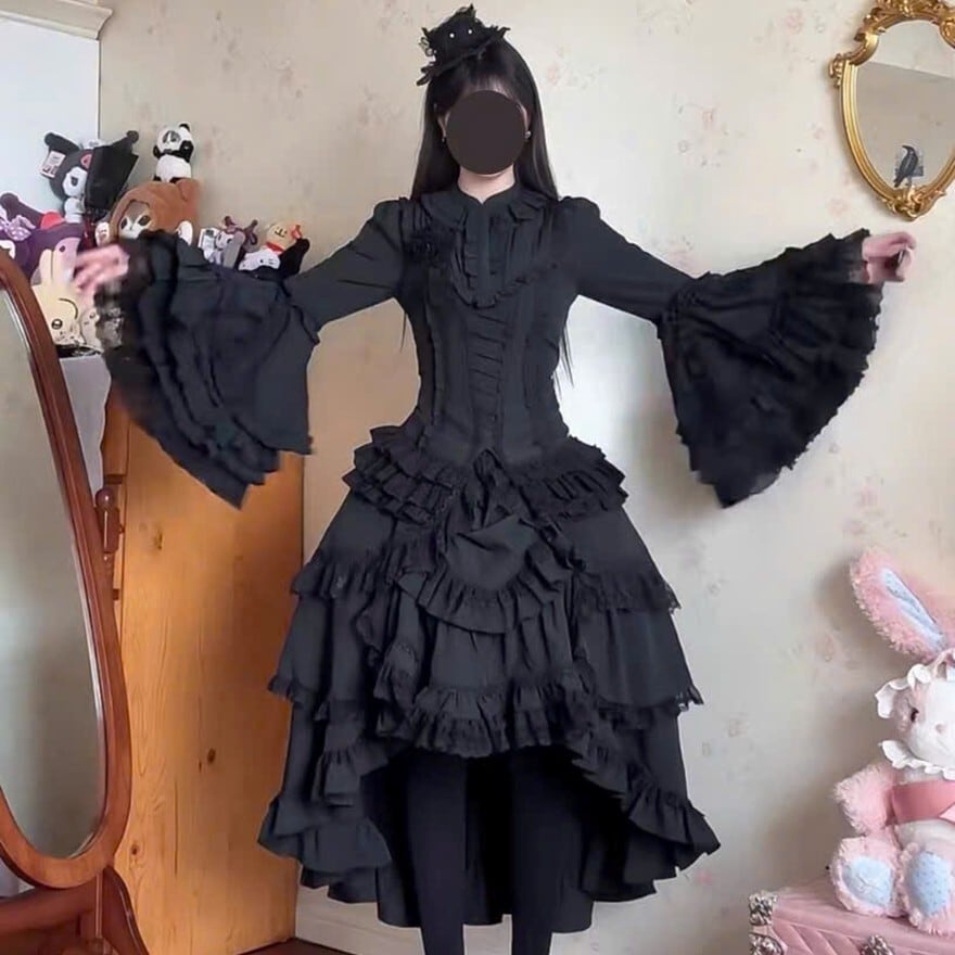 漆黒のフリルを幾重にも重ねたティアードスカートと、圧倒的な存在感を放つ超広がり袖が特徴の、本格的なゴシックロリータ・フルセットドレスです。