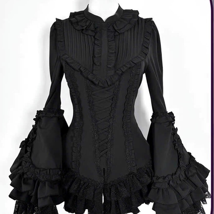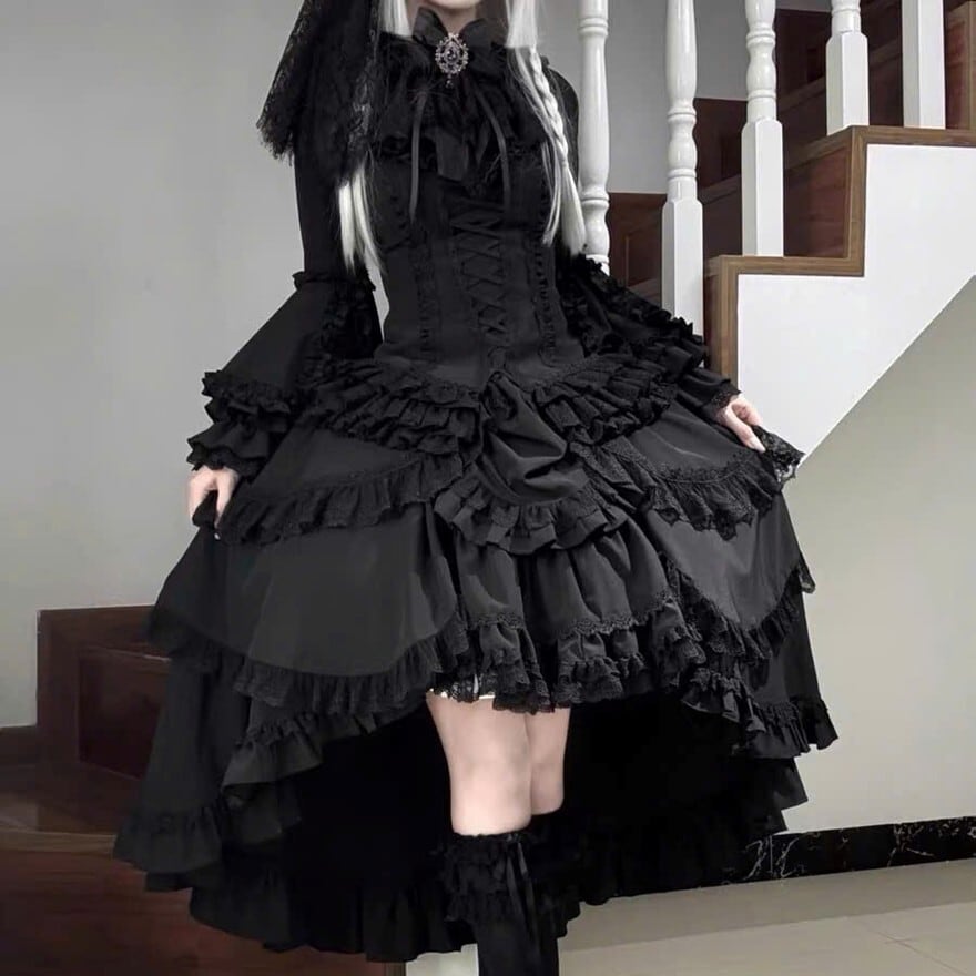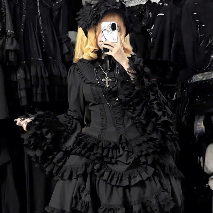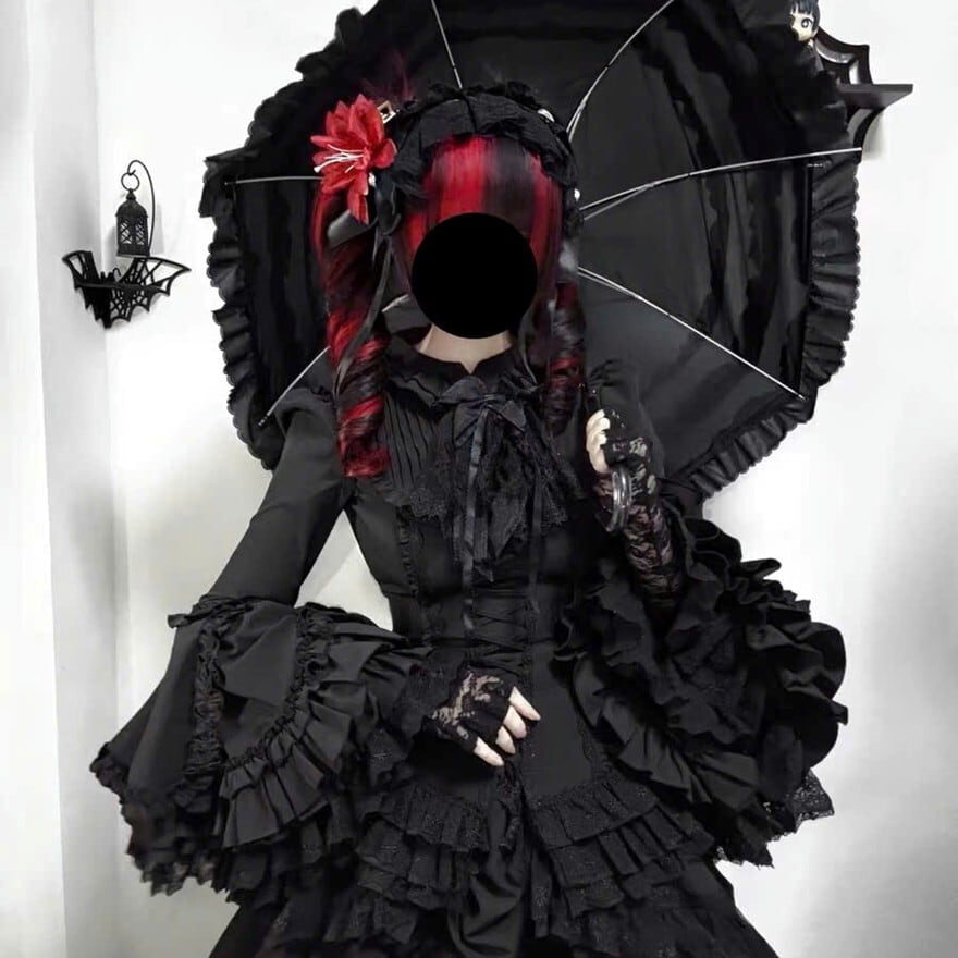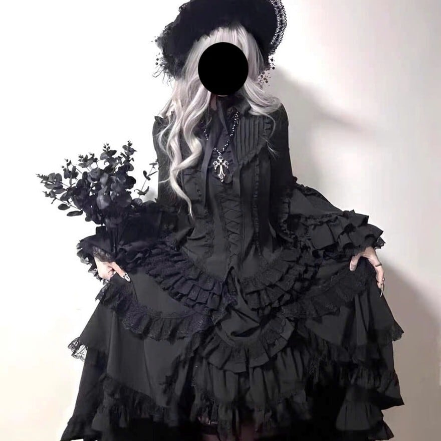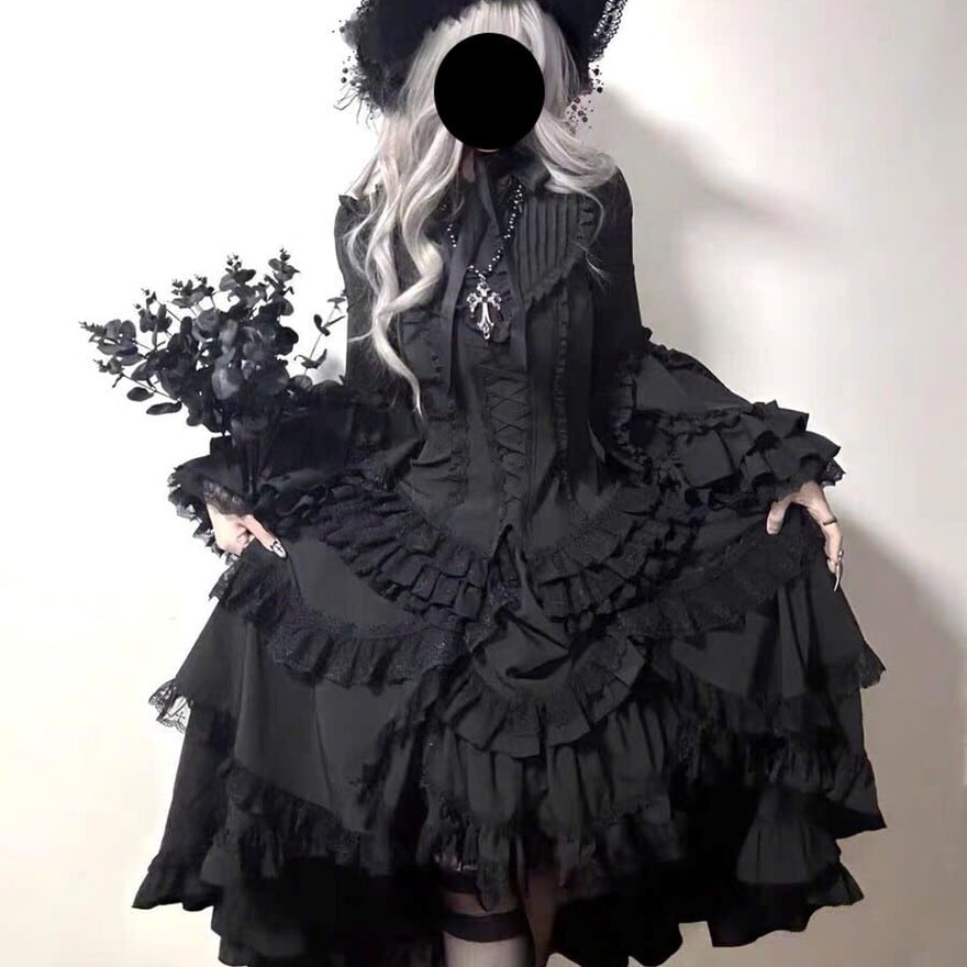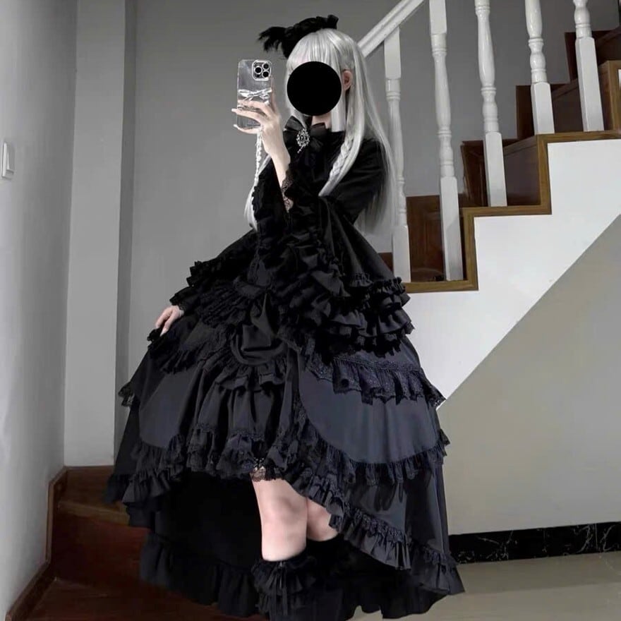 漆黒のフリルを幾重にも重ねたティアードスカートと、圧倒的な存在感を放つ超広がり袖が特徴の、本格的なゴシックロリータ・フルセットドレスです。