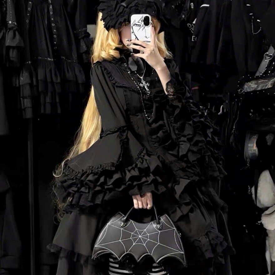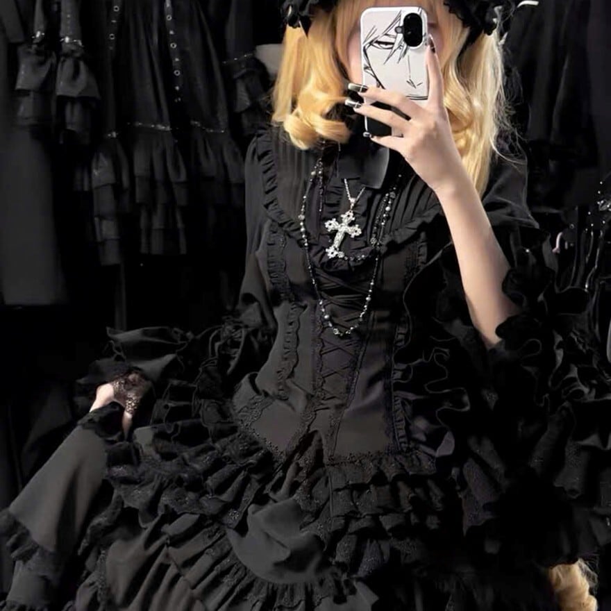 このドレスは、パーツごとに計算されたフリル量と、メリハリのあるコルセット風デザインを採用。初心者の方でも、袖を通すだけで専門店ならではの「完成されたゴシックスタイル」が手に入ります。全身を黒で統一しながらも、素材の重なりが奥行きを生むため、重たくなりすぎず上品に着用いただけます。