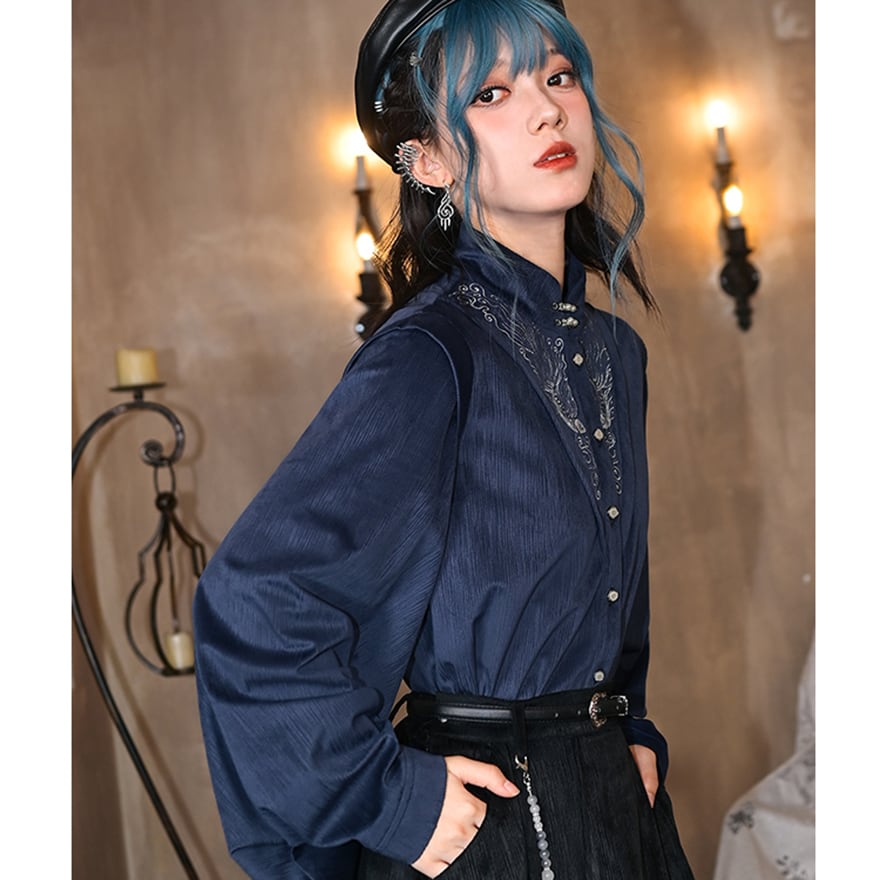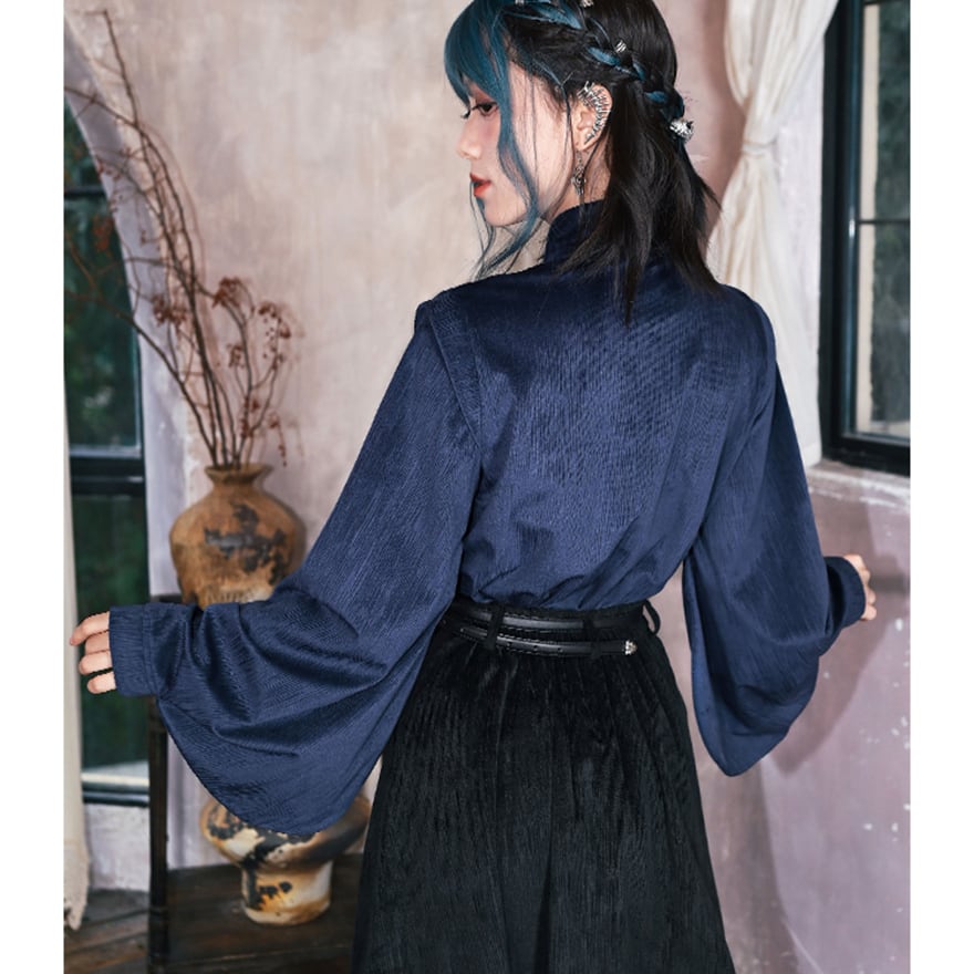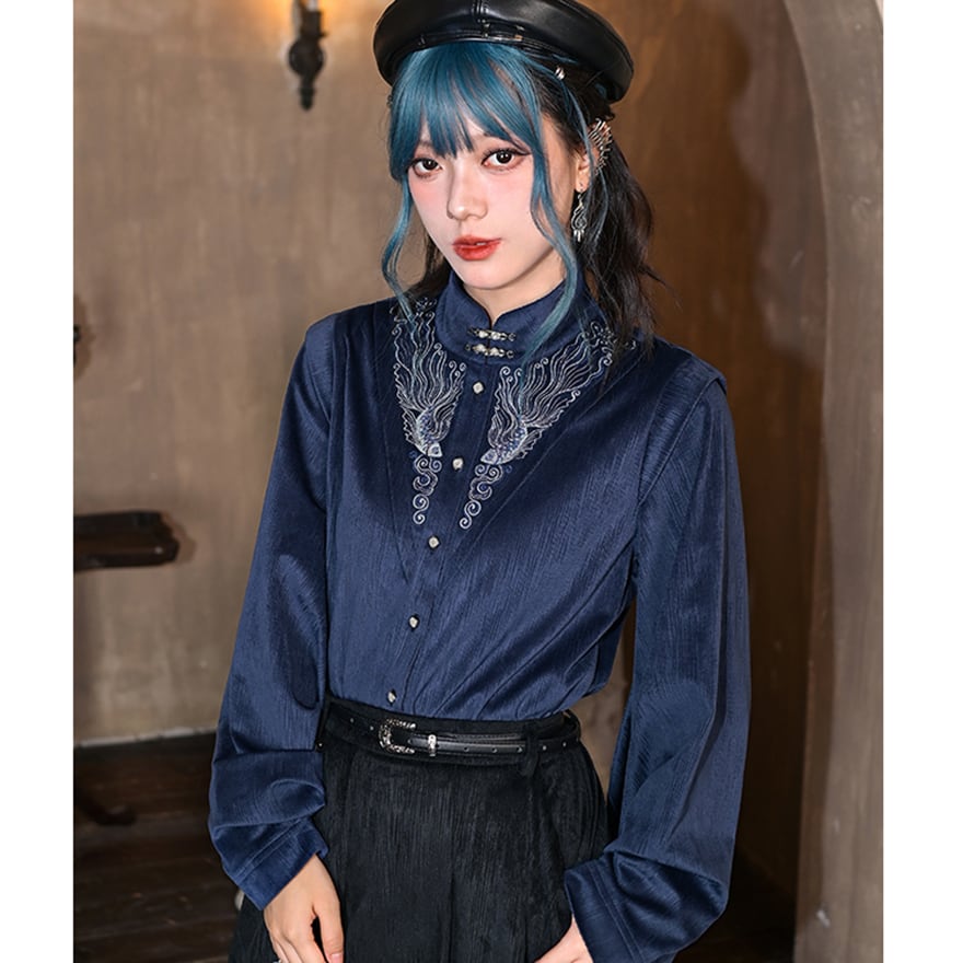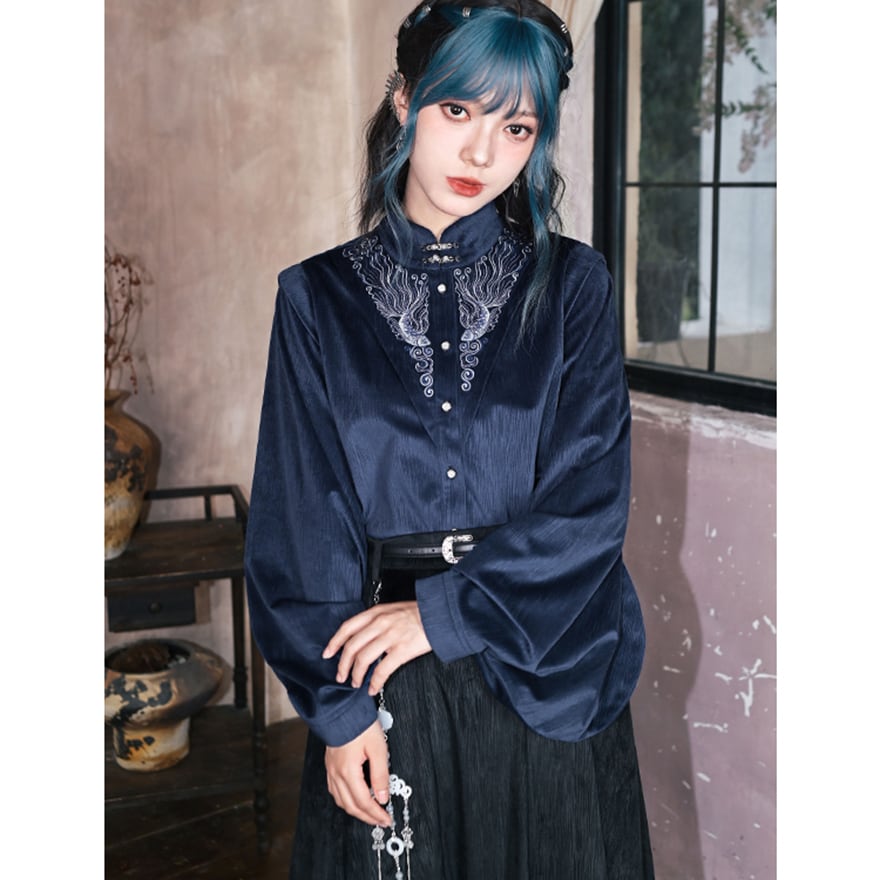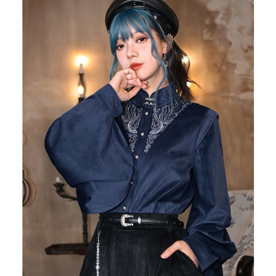 繊細なジャガード織りの生地に、伝統的な中華ボタンとクラシカルなバルモア襟を組み合わせた、上品で知的な印象を与える中華風(華ロリ)ブラウスです。