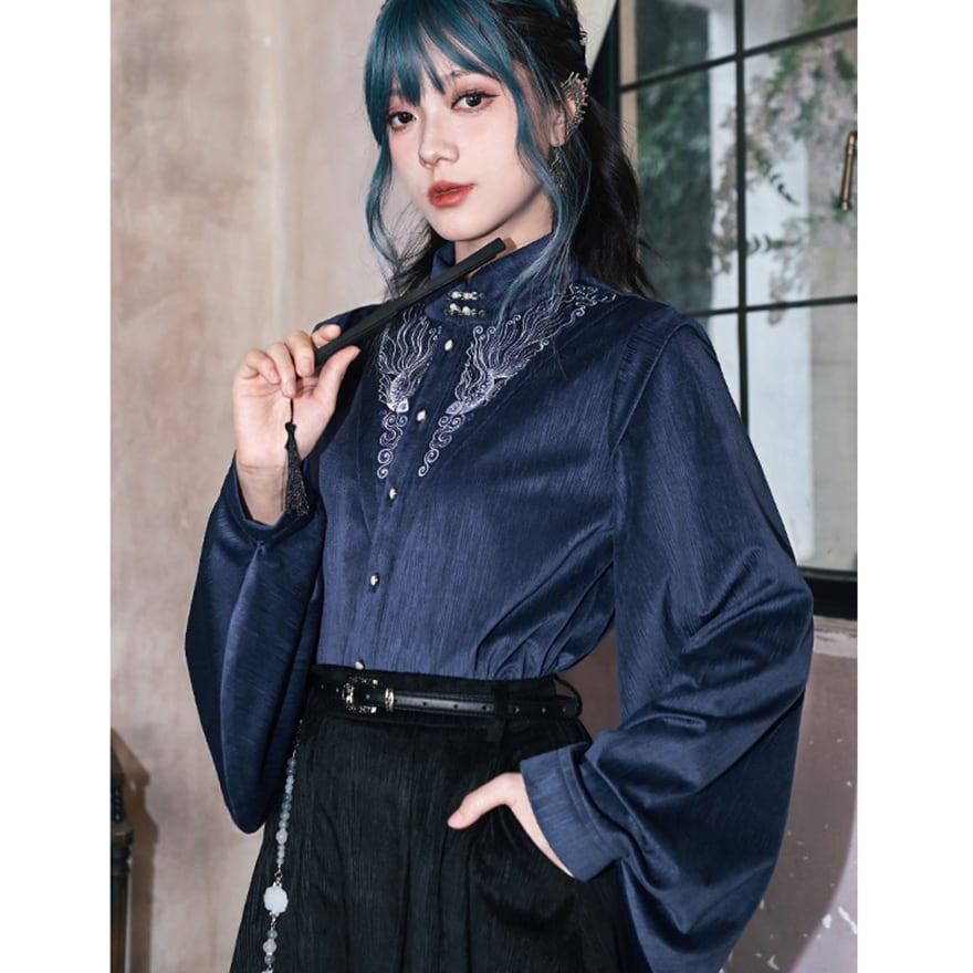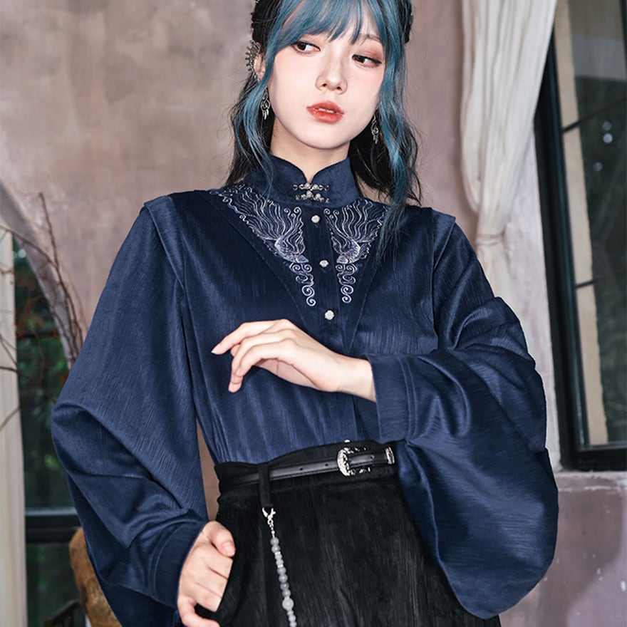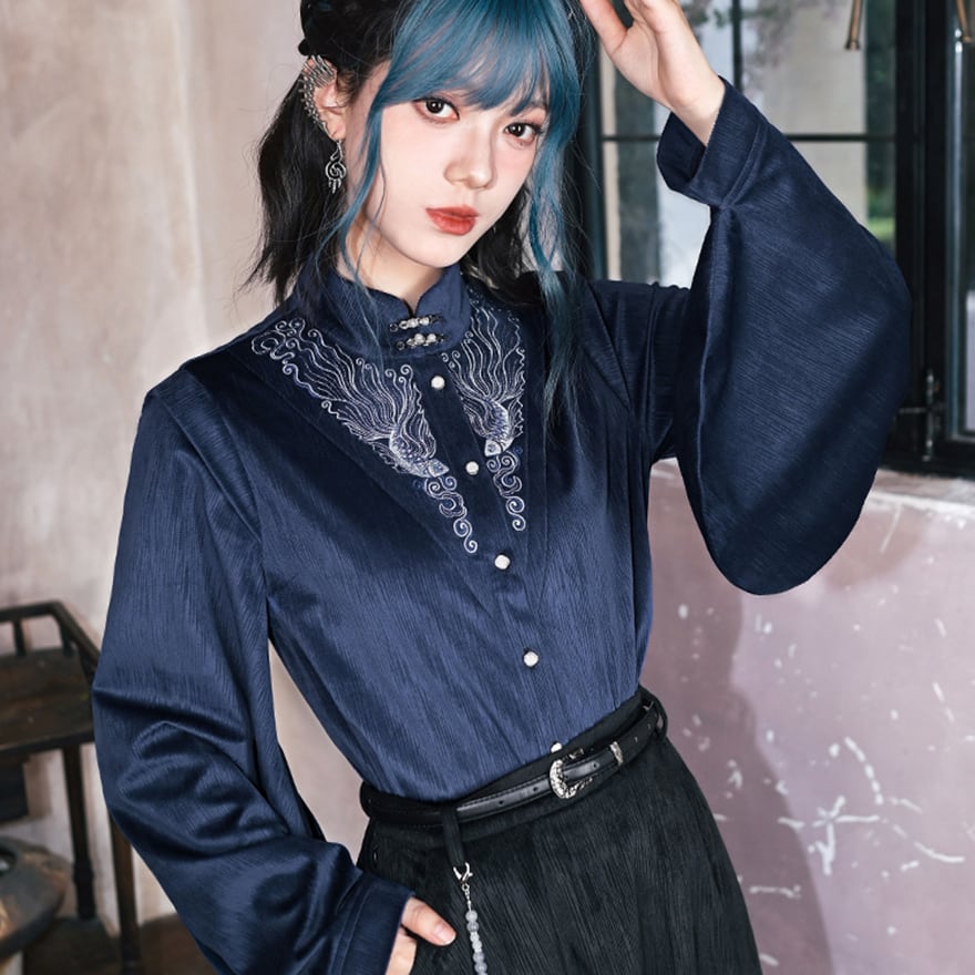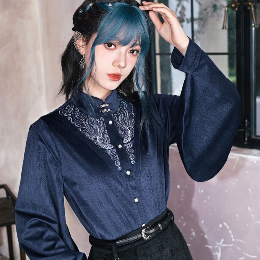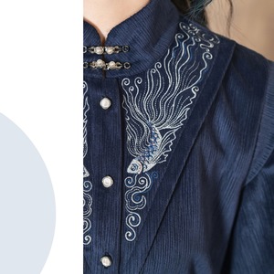 繊細なジャガード織りの生地に、伝統的な中華ボタンとクラシカルなバルモア襟を組み合わせた、上品で知的な印象を与える中華風(華ロリ)ブラウスです。