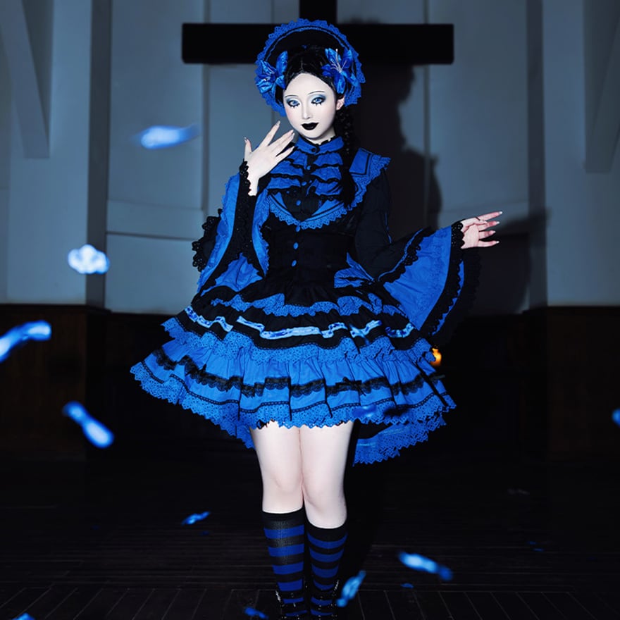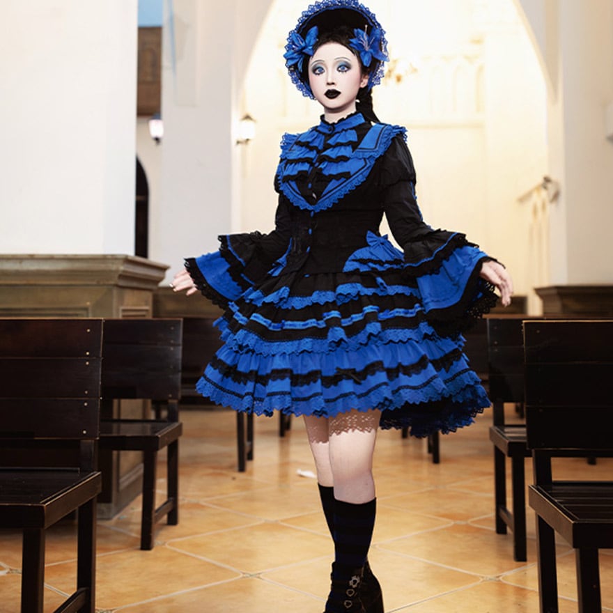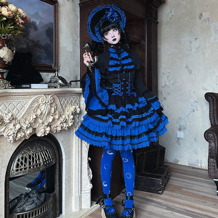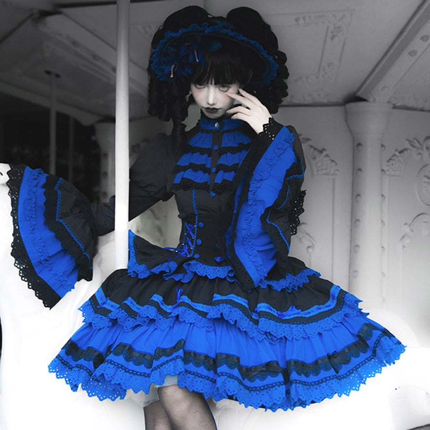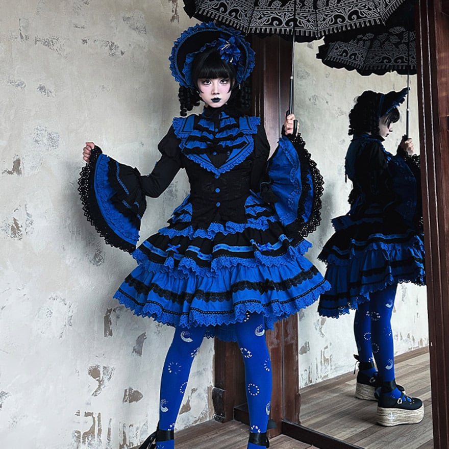 深みのあるロイヤルブルーと黒の配色により、個性的でありながらも上品で落ち着いた印象を与え、年齢を問わず「大人可愛い」サブカルファッションを楽しめます。