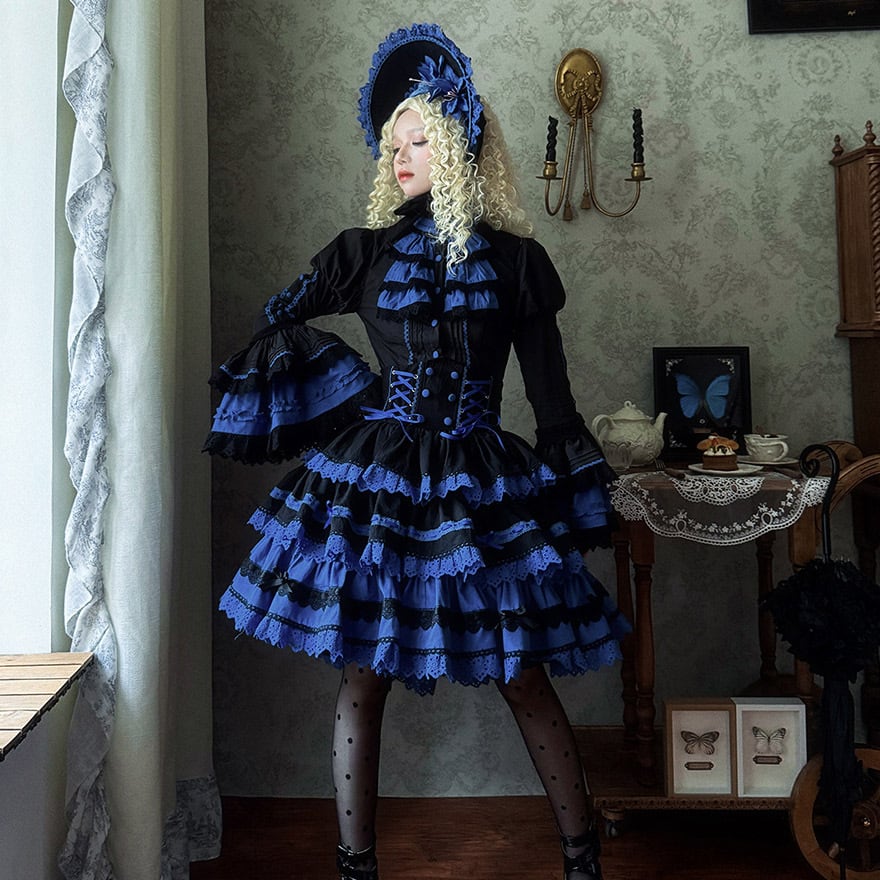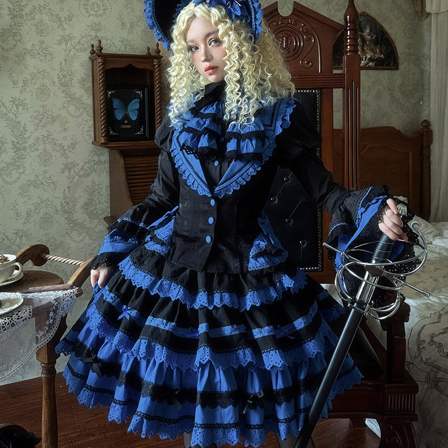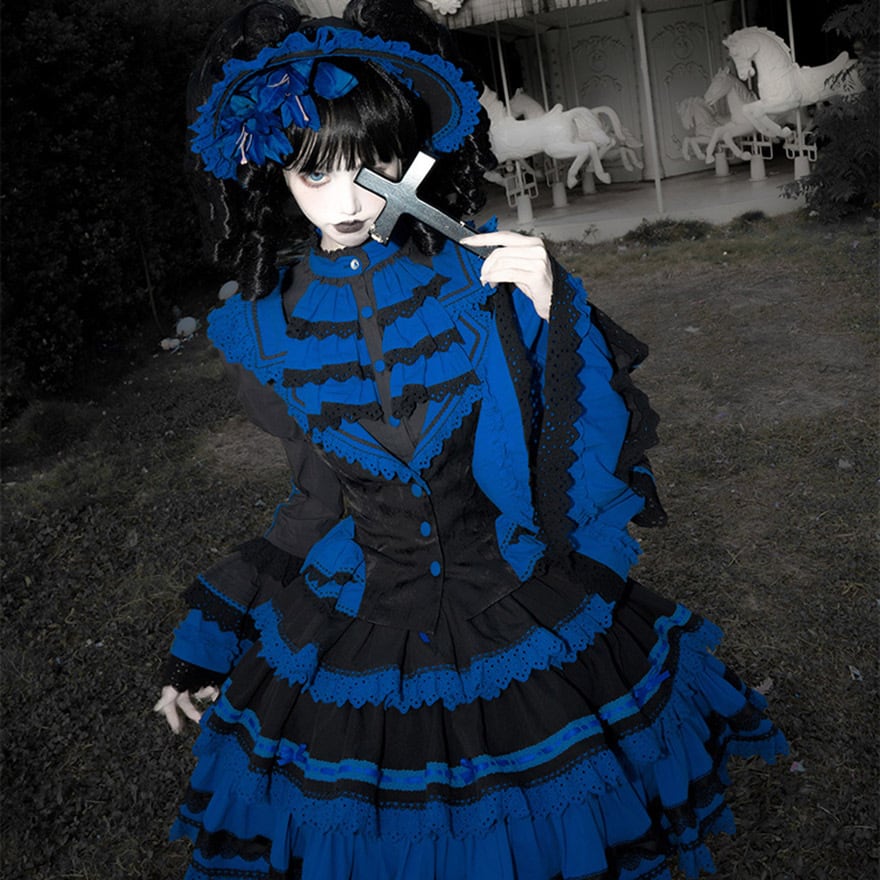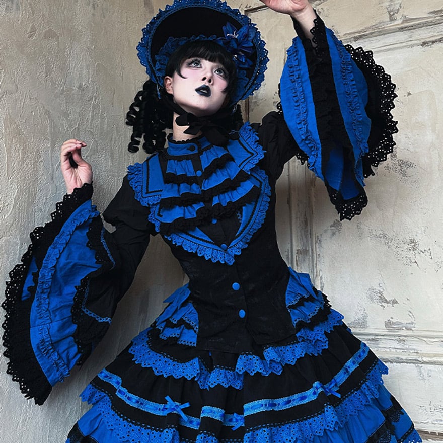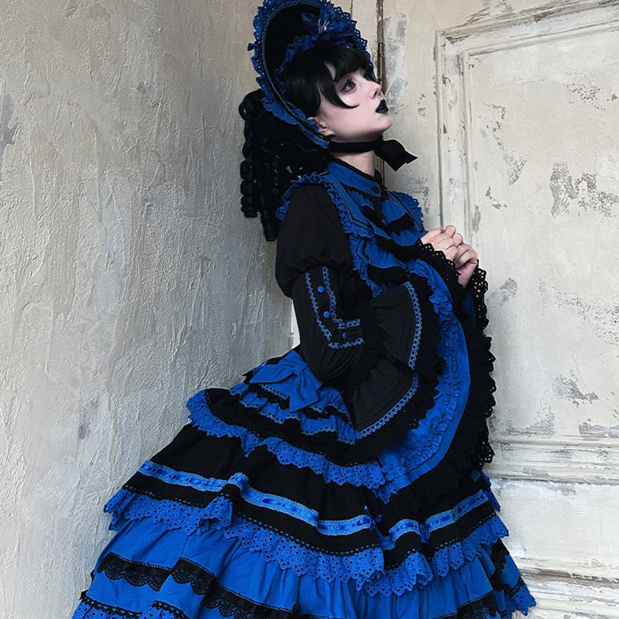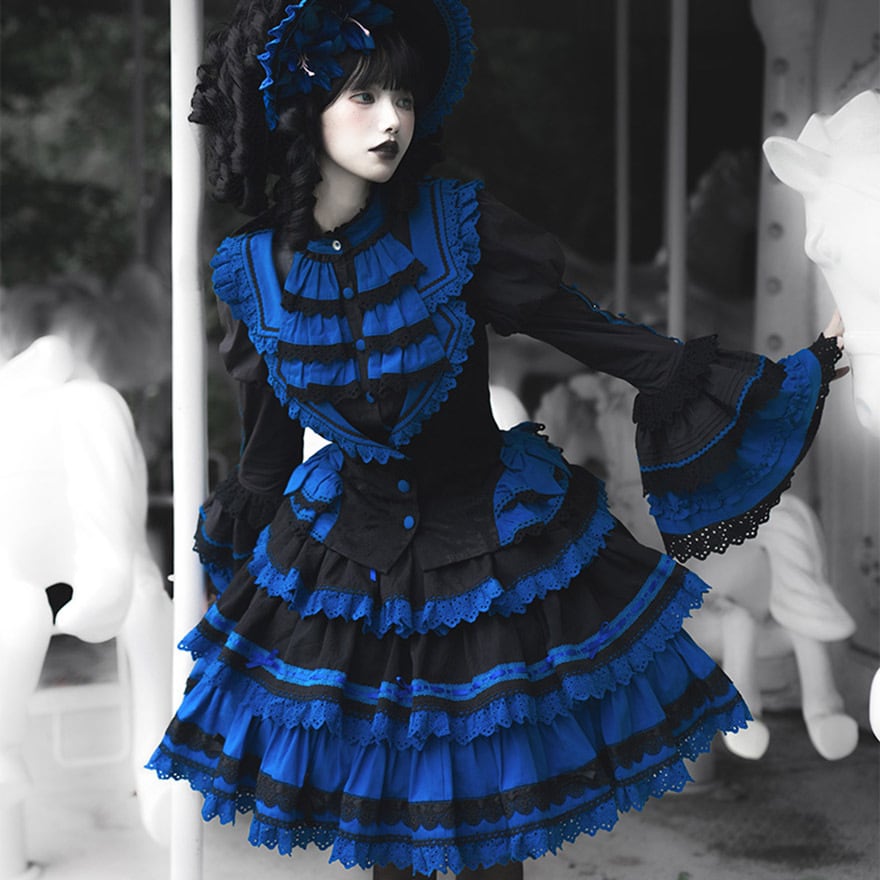 「青と黒のコントラストが美しいゴシックロリィタ好きな人に向けた、ブラウス・ベスト・スカートの豪華3点セットアップです。」