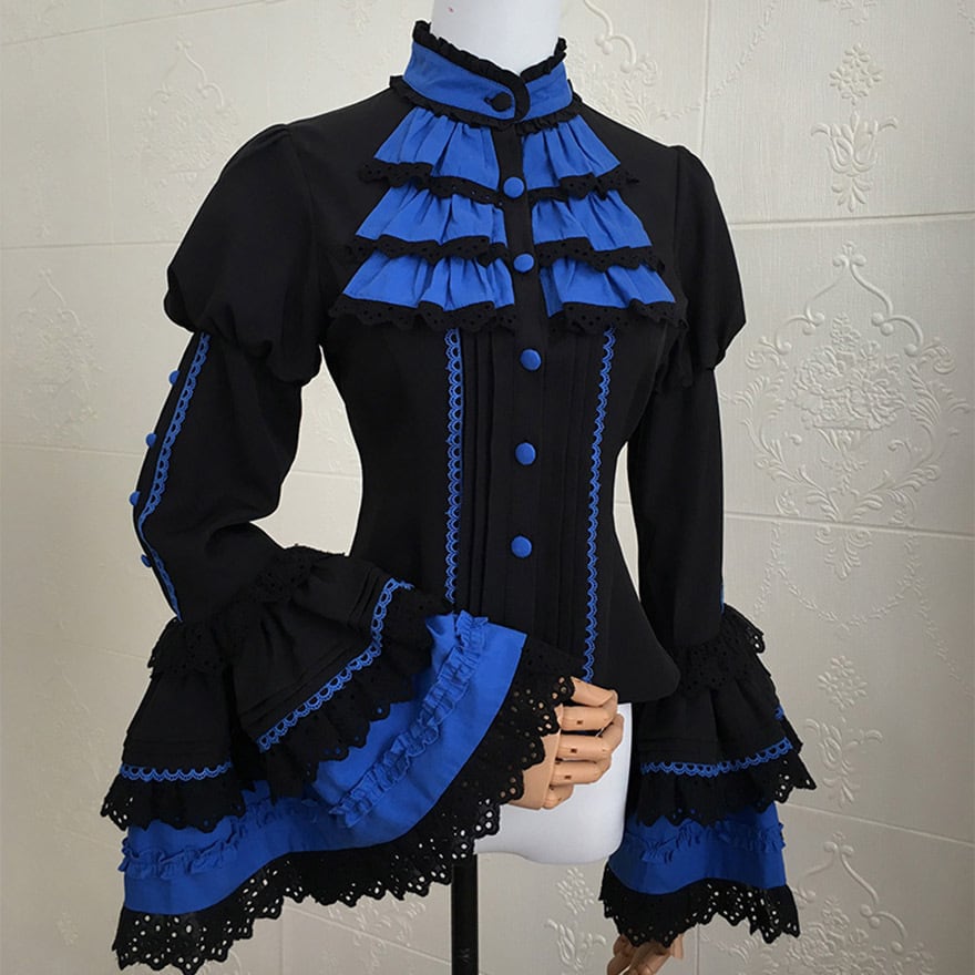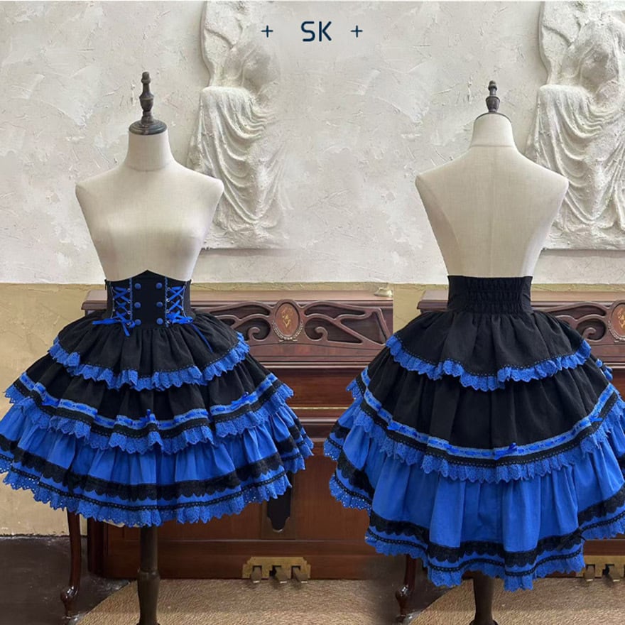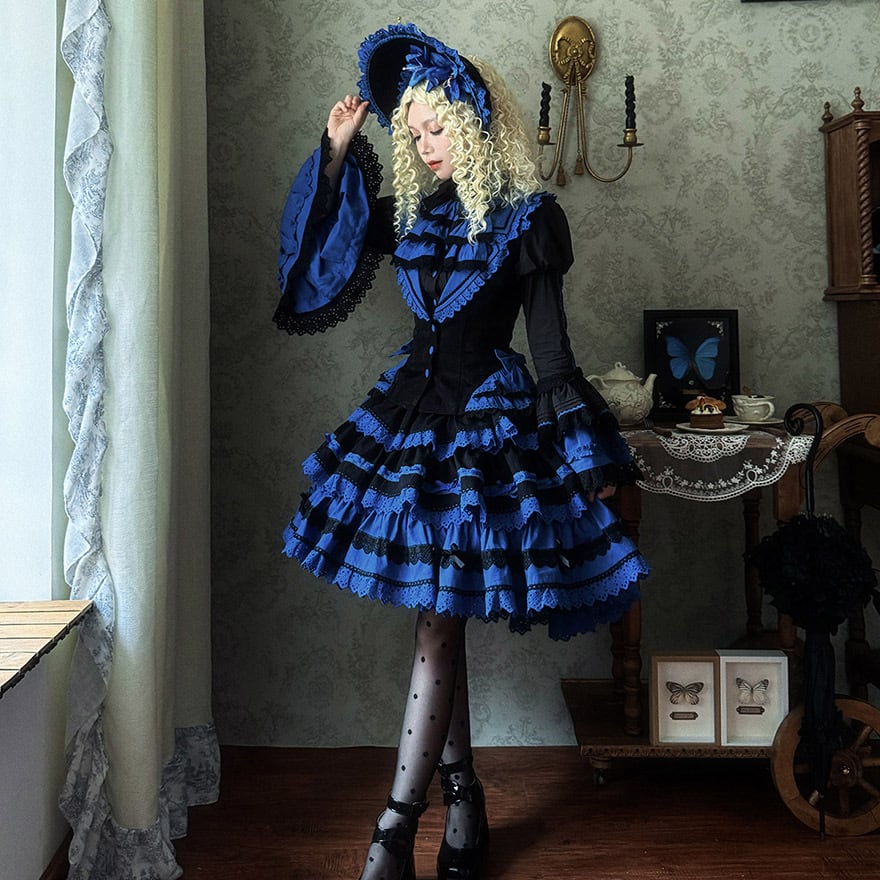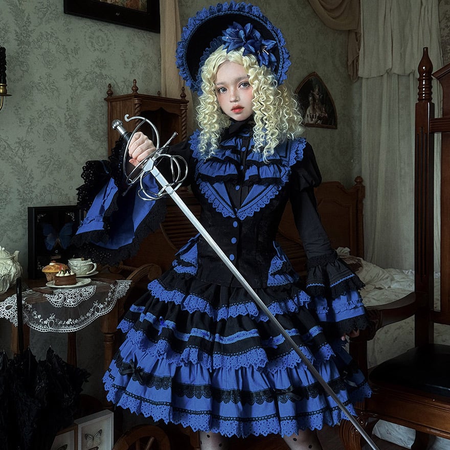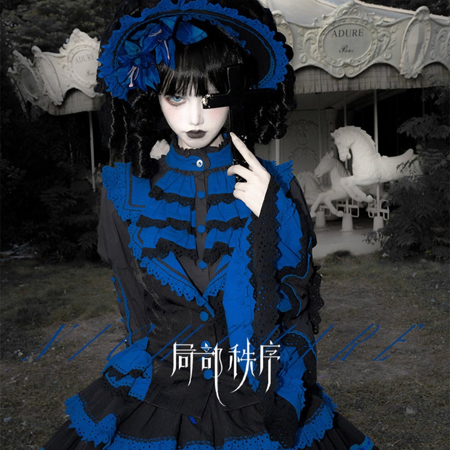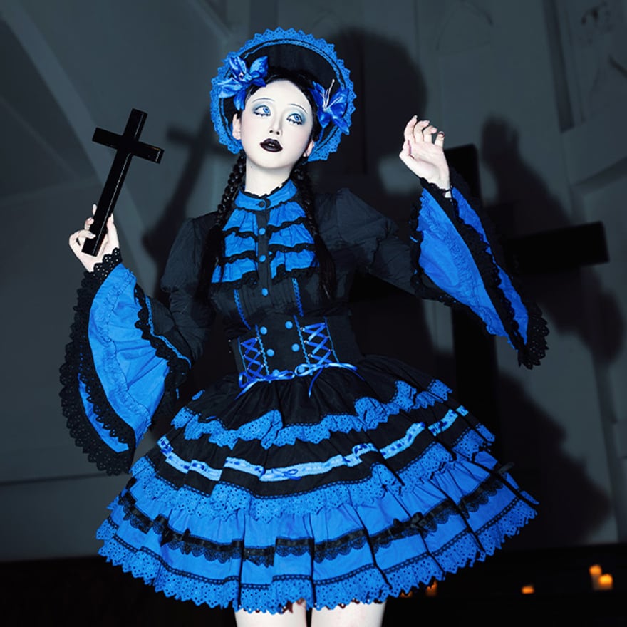 「青と黒のコントラストが美しいゴシックロリィタ好きな人に向けた、ブラウス・ベスト・スカートの豪華3点セットアップです。」