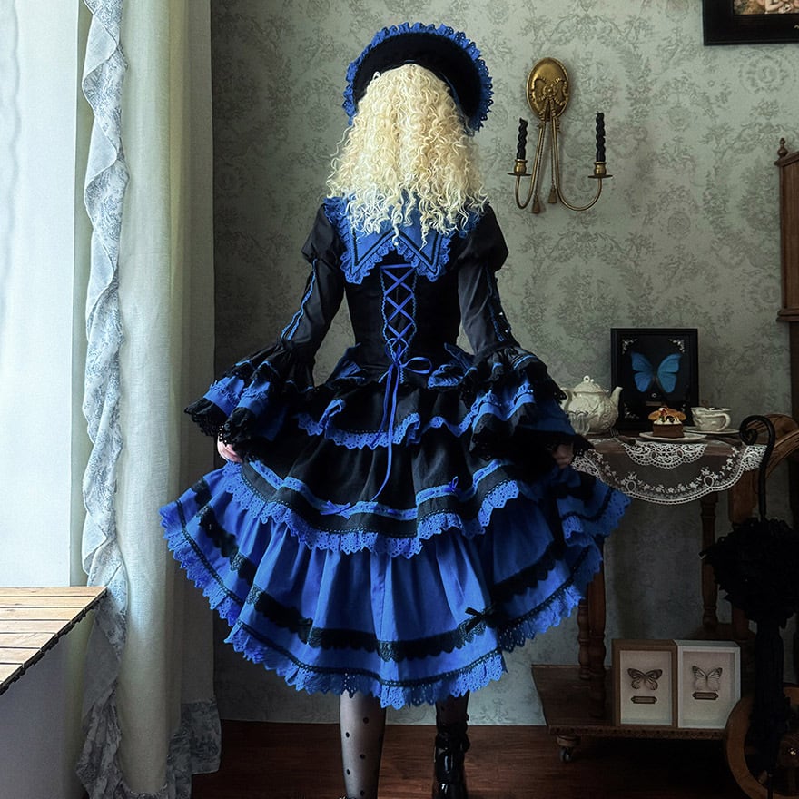 ボリュームのある多層スカート: 幾重にも重なったフリルスカートが、歩くたびにドラマティックに揺れ、非日常的なエレガンスを演出します。