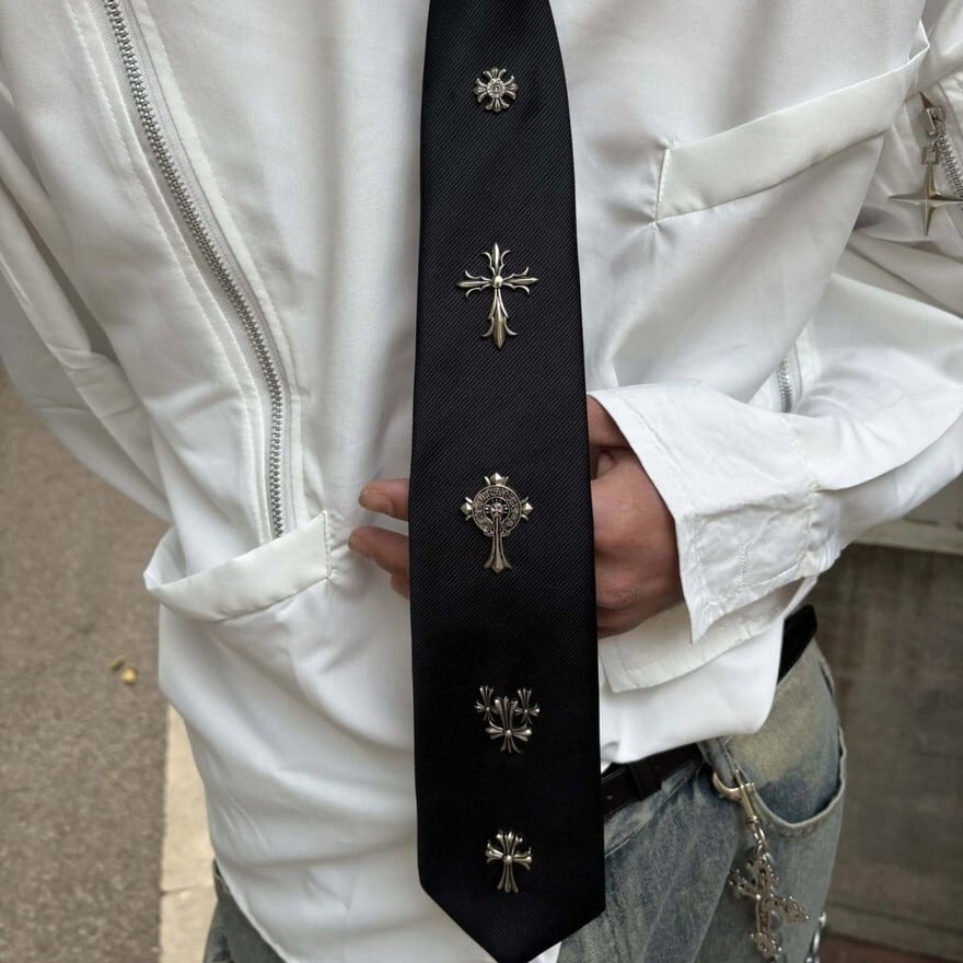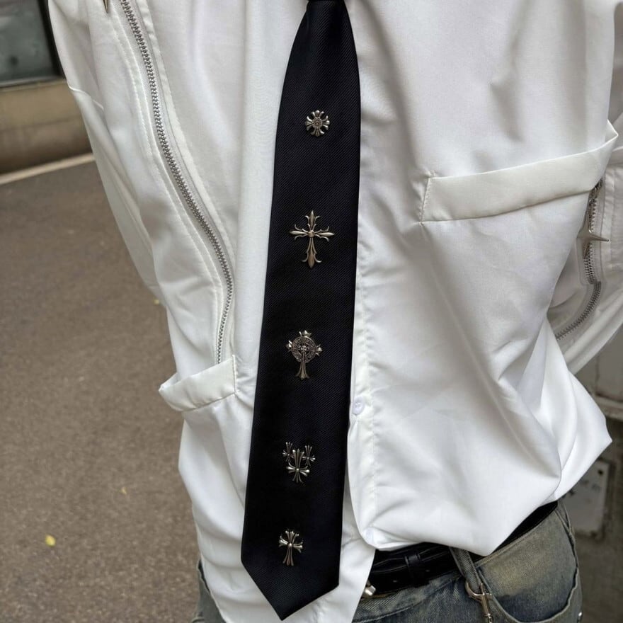 ライブや男装コーデのワンポイントに!地雷系 ゴシックメタル ネクタイ 十字架パーツ 闇可愛い モード系