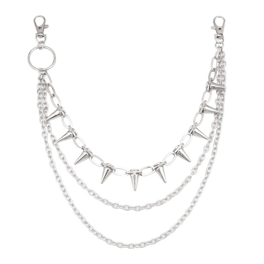 地雷系やパンクファッションの個性を引き立てたい方に向けた、エッジの効いたスパイク(トゲ)スタッズと3種類の異なるチェーンを組み合わせたシルバーウエストチャームです。