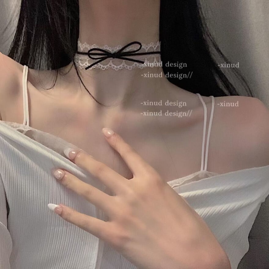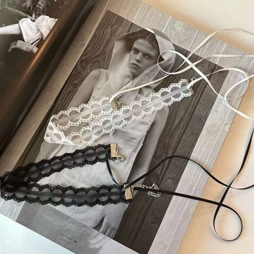 リボン付きレースチョーカー: 繊細なホワイトレースに細身のブラックリボンを配置。