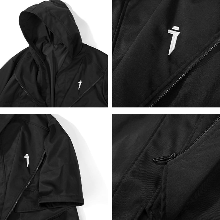 鋭いカッティングが目を引く、近未来感溢れるタクティカルコート。