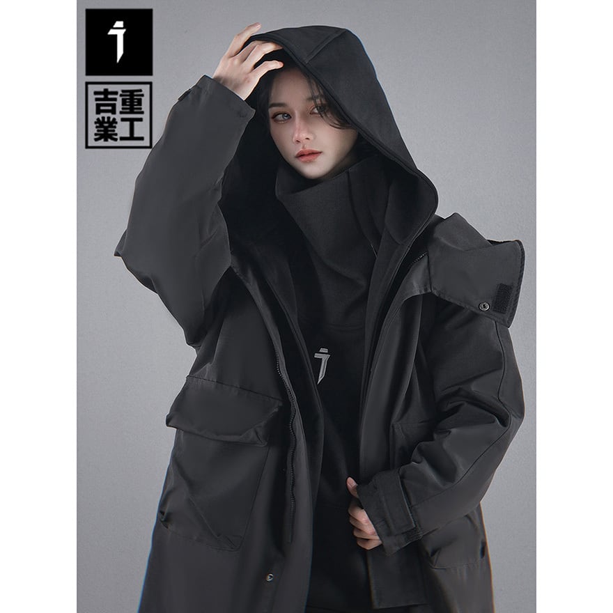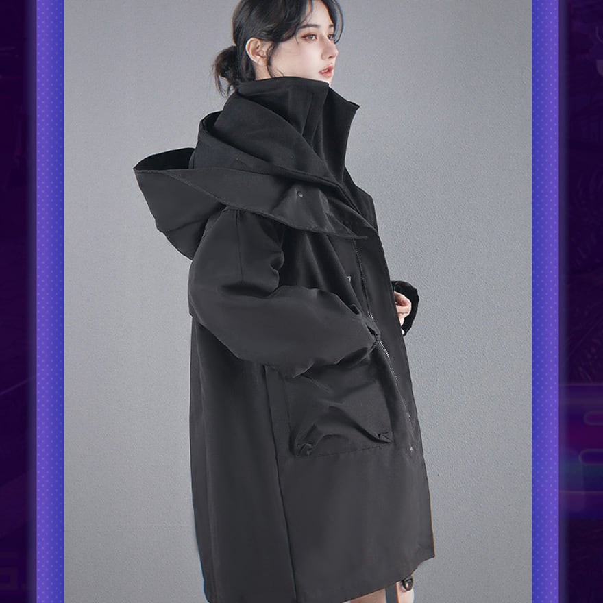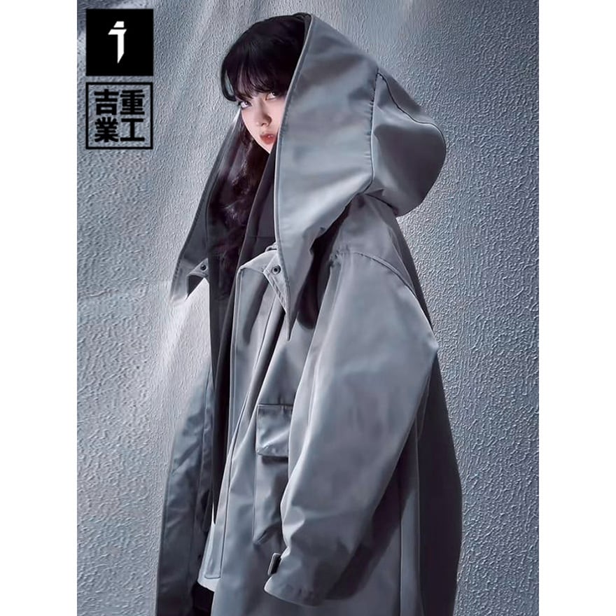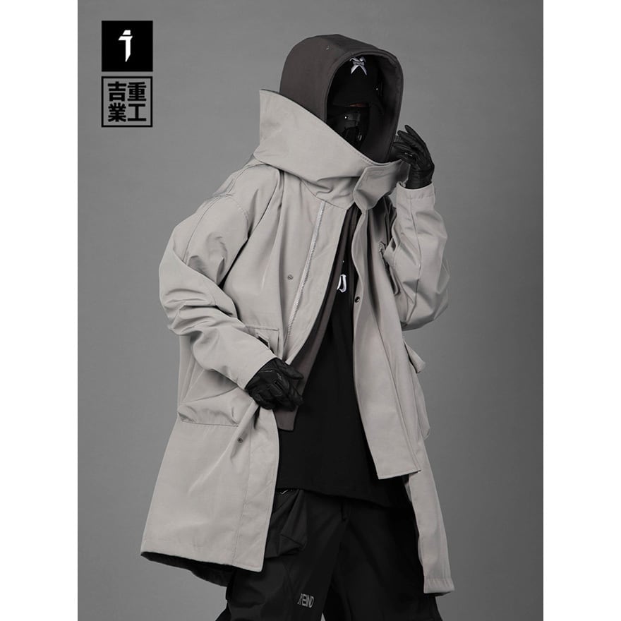 近未来の境界線を歩く、洗練されたタクティカルロングコート。深く設計された変形フードと、前後の長さを変えたフィッシュテールが織りなす立体的なシルエットが魅力です。無機質な質感とソリッドな黒・灰の色展開が、地雷系やサブカル系の冬を冷徹に彩ります。