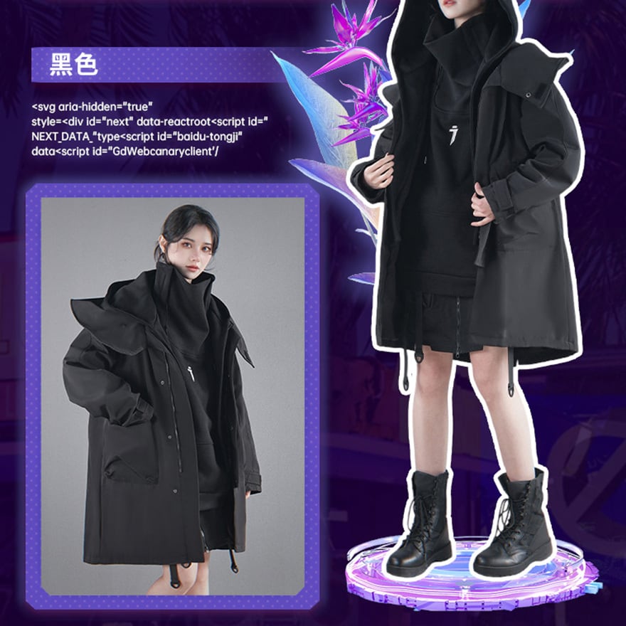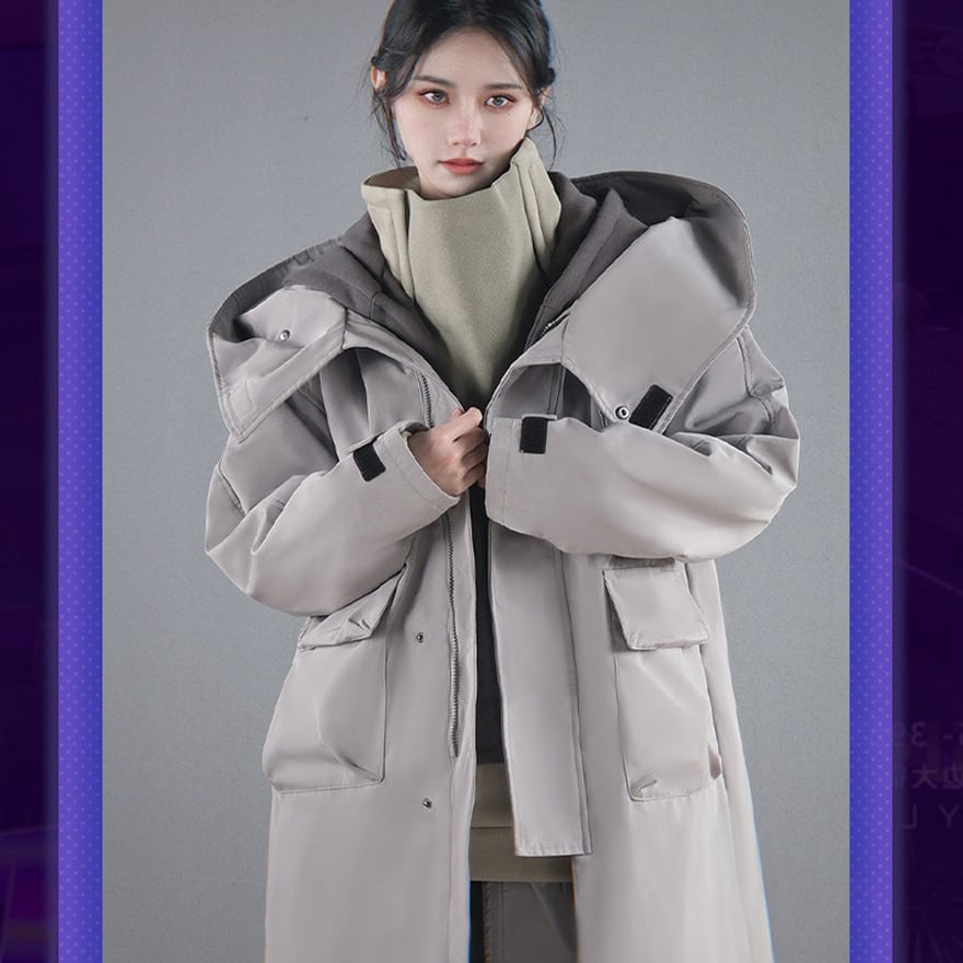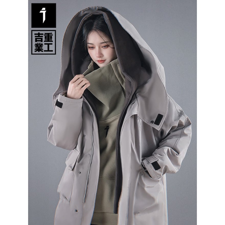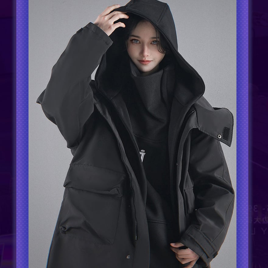 近未来の境界線を歩く、洗練されたタクティカルロングコート。深く設計された変形フードと、前後の長さを変えたフィッシュテールが織りなす立体的なシルエットが魅力です。無機質な質感とソリッドな黒・灰の色展開が、地雷系やサブカル系の冬を冷徹に彩ります。
