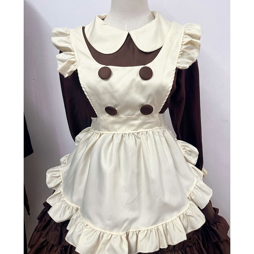 濃厚なチョコレートブラウンのワンピースに、クリームのようなアイボリーのエプロンを合わせた、まるでスイーツのような配色のメイドコスチュームです。