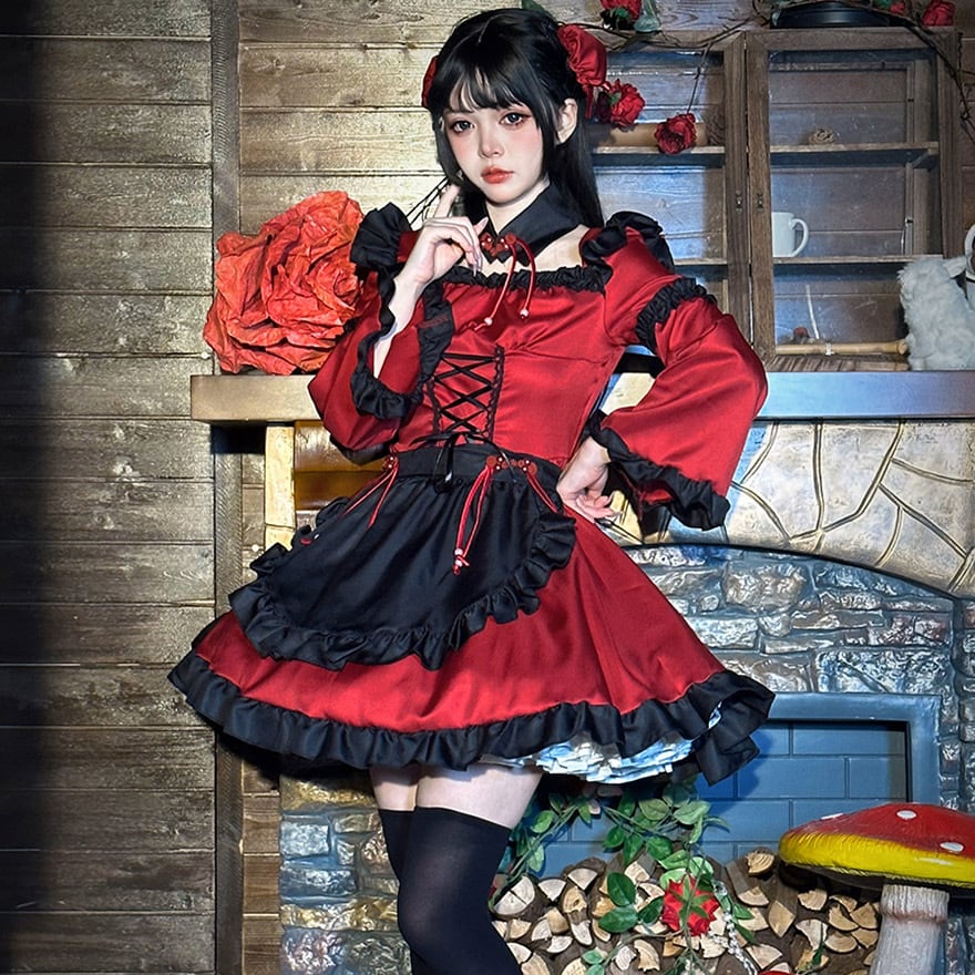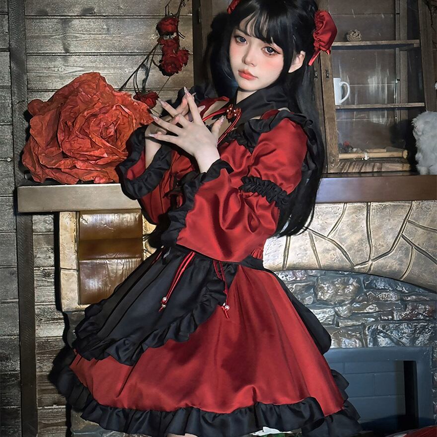 中華ロリィタ・赤ずきんの誘惑*深紅のチャイナ風エプロンドレス 2点セット コスチューム イベント メイドカフェ衣装