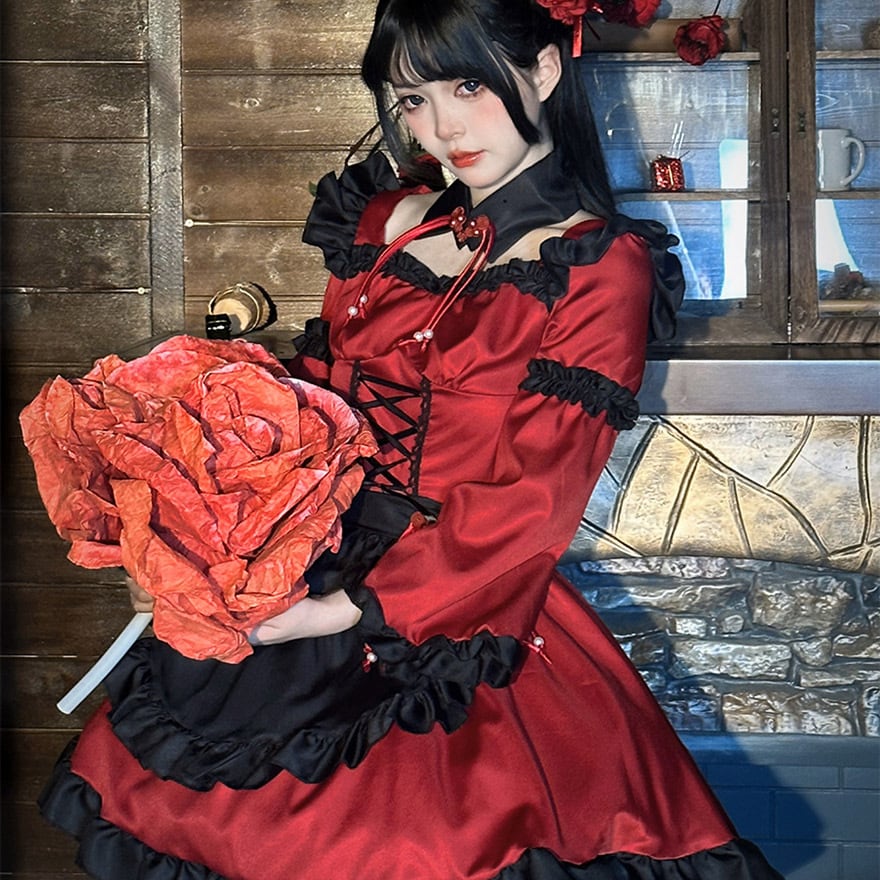 深みのあるレッドのサテン生地に、ブラックのフリルとエプロンを重ねた、中華風デザインのセットアップ衣装です。