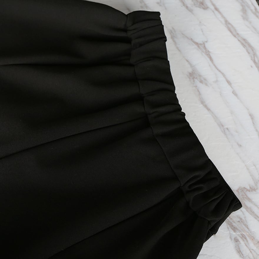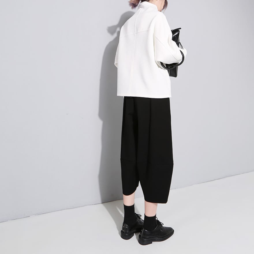 ハリのあるブラック生地を使用し、太もも周りにゆとりを持たせた丸みのある立体的なシルエットが特徴的なクロップドパンツです。